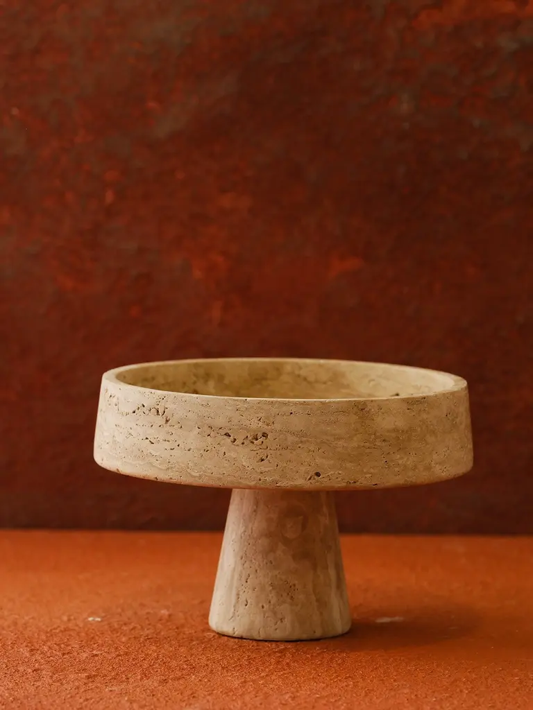 The Travertine Pedestal Serving Stand brings timeless elegance and grounded beauty to your tabletop rituals. Hand-carved from natural beige travertine, this piece features a wide, shallow bowl elevated on a gently flared cylindrical base—blending sculptural simplicity with versatile function. Whether used to present fruit, pastries, or candles and objets d’art, it adds elevated charm to kitchen counters, dining tables, or curated displays. The soft veining and matte stone surface make each piece a unique expression of nature and craft.