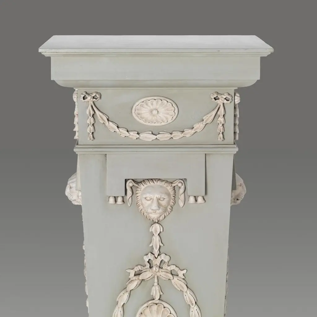 A fine pair of Hepplewhite designed tapered pedestals with carved classical decoration.Bespoke sizing, design adaptations and finishing available.We are currently working to a 30-36 week lead time.