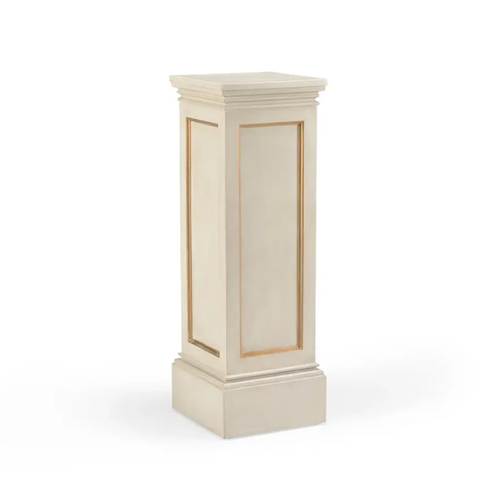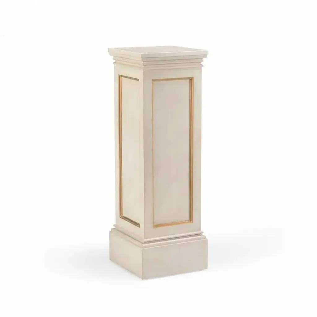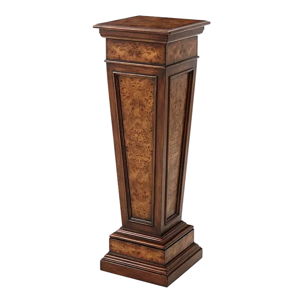 This large pedestal to showcase vases or sculptures is a piece of art in itself. Wood base with walnut finish, the top is a chestnut brown glass with a gold leafed edge. By designer Bradshaw Orrell.