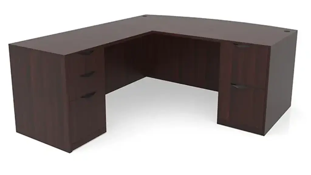 PL Series Curved Corner Bow Front L-Shaped Desk features a durable laminate finish & 3mm edge banding. Bow Front provides you with extra desk space and allows guests to pull up and work with you. Curved inside corner on the L-Desk allows you to work into the corner of the L-Desk comfortably. The Curved corner L-Desk is not reversible and needs to be ordered with the return side on the left or right. Desk features a full size File File Pedestal and Box Box File. Drawers lock for security. File drawers accommodates letter or legal size files. Available in several laminate finishes. Ships ready for easy set up - pedestals ship fully assembled.