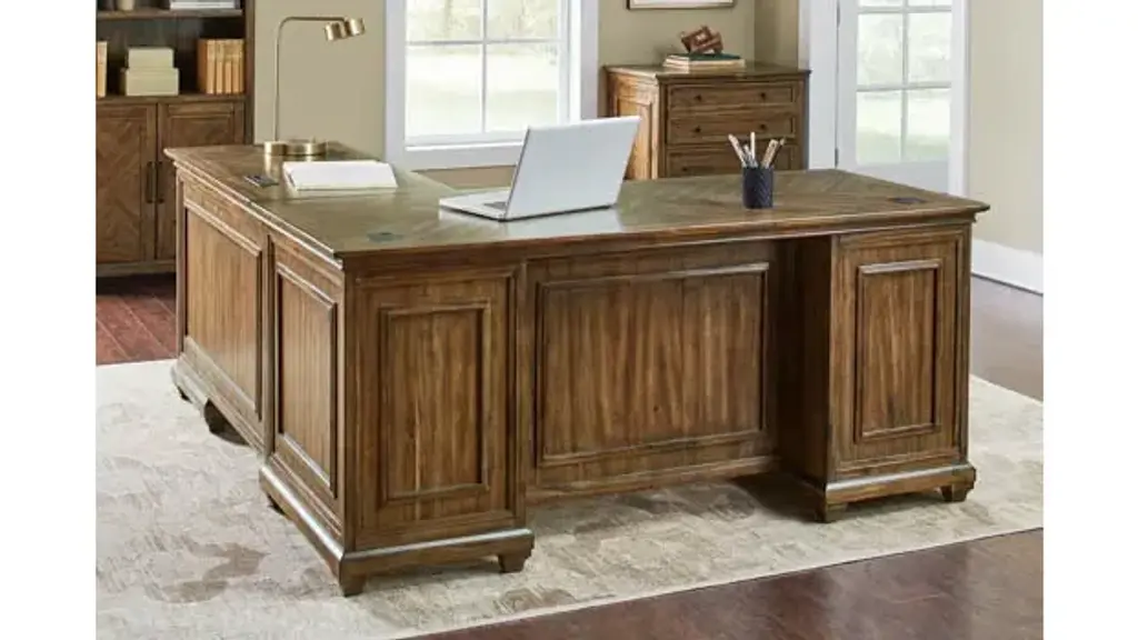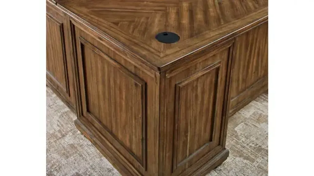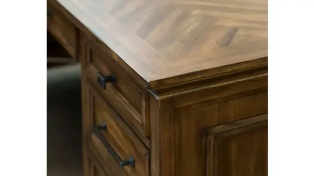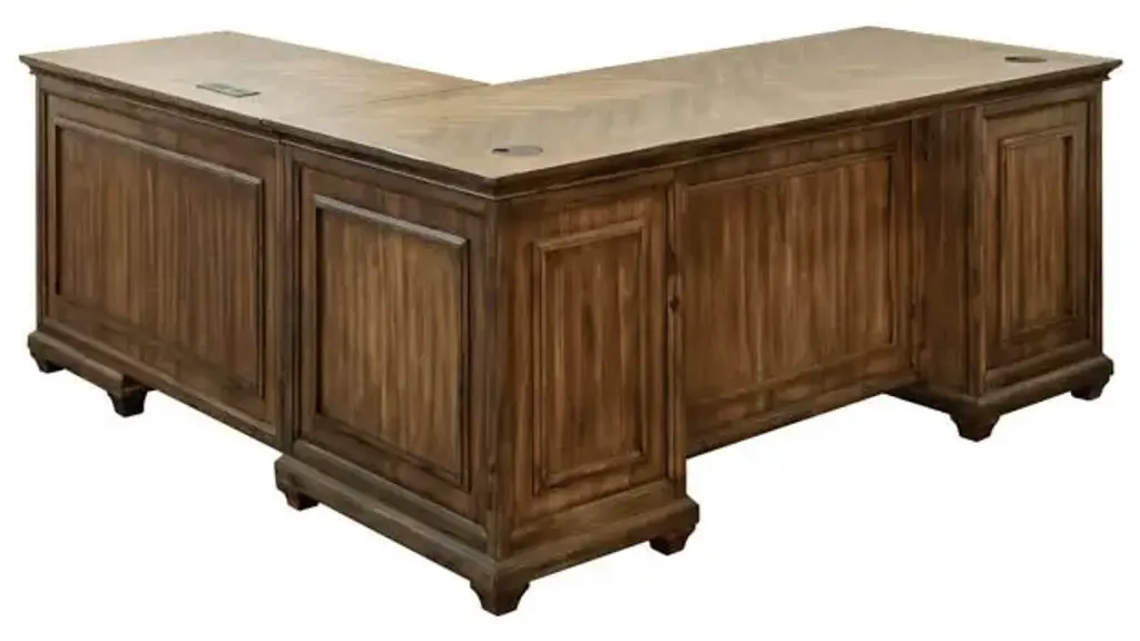 Porter is a standout collection with classic style. Natural wood veneers finished in warm brown with soft gold undertones feature a unique herringbone pattern with center “X” design. The vintage finish allows the natural wood grain to show through with added detail for an aged appearance, creating a casual yet elegant look. Captured end panels with additional moldings emphasize its clean straight forward appeal. Two locking file drawers. Four utility drawers. Two Keyboard/pencil drawers with ball bearing glides. Desk has two grommets for wire management. Power center with AC power outlets and USB 2.0 ports for convenient charging. Mottled antique hardware enhances the look of the collection. Finished on all sides. Overall Dimensions: 68" W x 70" D x 30" H. Ships ready for easy assembly.