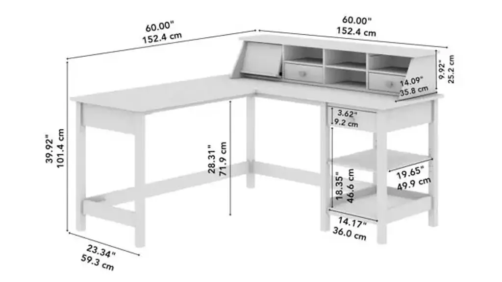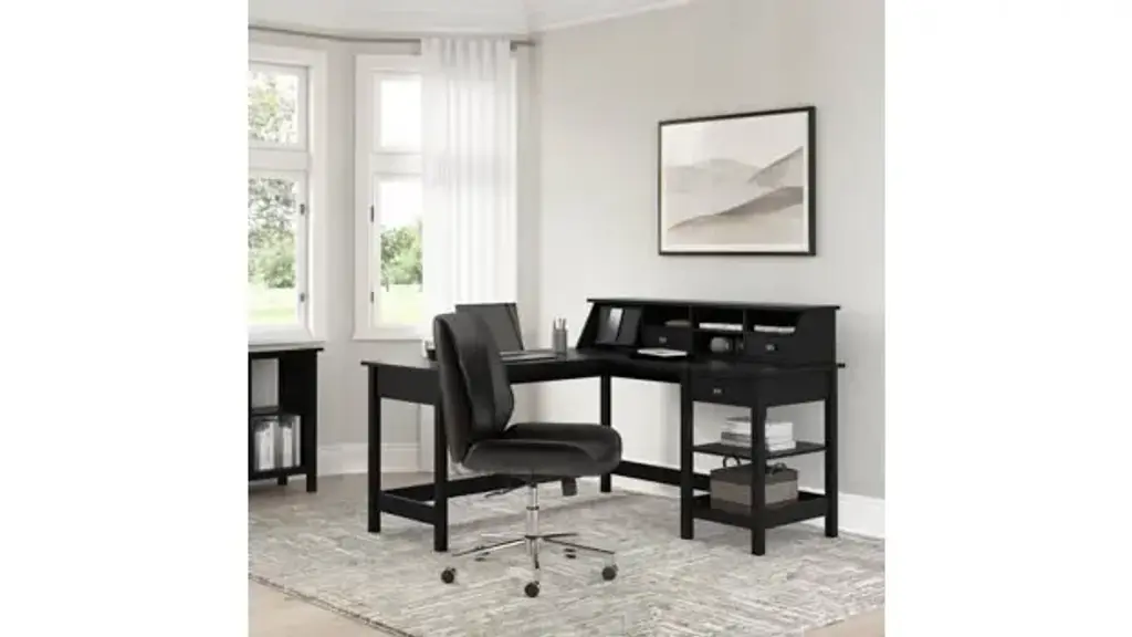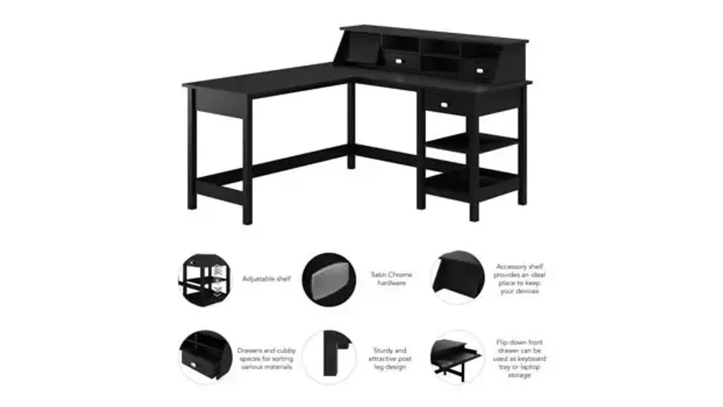 Bring a contemporary flair to your home office with a workspace that's simple, stylish and functional. The Bush Furniture Broadview 60"W L-Shaped Computer Desk with Desktop Organizer offers plenty of room to spread out while keeping work materials accessible. The durable 60"W x 60"D corner desk surface easily supports a computer, books and more with a weight capacity of 200 lbs. Two shelves and a small box drawer on the right side of the L-Desk ensure that papers, writing utensils, notebooks and other office supplies stay within reach as you get to work on your next project or assignment. The bottom shelf is fixed for stability while the upper shelf can be raised or lowered to accommodate items of various sizes. The Desk Organizer adds 8 cubby spaces with two drawers that fit in any compartment for a custom configuration. A pull-out accessory shelf provides an ideal place to keep your phone, tablet or other devices and can be installed on whichever side you prefer. A crisp Classic Black finish is complemented by Satin Chrome drawer pulls for a contemporary style with long-lasting appeal. Increase the storage and display capacity of your workspace as needed with a wide variety of Broadview products, including File Cabinets and Bookcases (coordinating items sold separately). This corner computer desk with storage set is tested to meet ANSI/SOHO quality standards for safety and performance. Overall Dimensions: 60"W x 60"D x 39.92"H Ships ready for easy assembly.