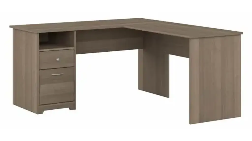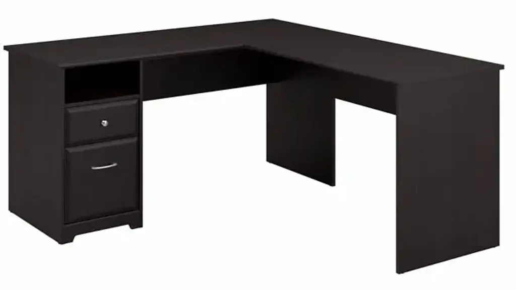 Create a stylish, functional and organized home office with the Bush Furniture Cabot 60"W L-Shaped Computer Desk with Drawers. The spacious work surface allows you to spread out with your laptop, papers, printer and more with room to spare. Store files and supplies in the included drawers and open cubby shelf, designed for quick and easy access. A smooth full-extension drawer opens effortlessly on reliable ball bearing slides so you'll have no trouble reaching your letter or legal-size files. Beautiful Chrome-finished hardware is the perfect match for the laminate finish, and the space-saving desk design is ideal for placement in a corner. The L-Shaped Computer Desk with Drawers meets ANSI/SOHO quality test standards for safety and performance. See the full collection of coordinating home furnishings, and design your dream office with the elegant and efficient Cabot Collection. Overall Dimensions: 60"W x 65.20"D x 29.96"H. Ships ready for easy assembly.