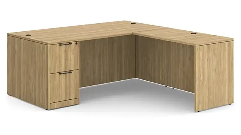 Durable laminate finish. Impact resistant edge protection. L-desk is fully reversible. Box Box File and File File Pedestals lock for security. File drawers accomodate letter or legal files. Ships ready for easy assembly.