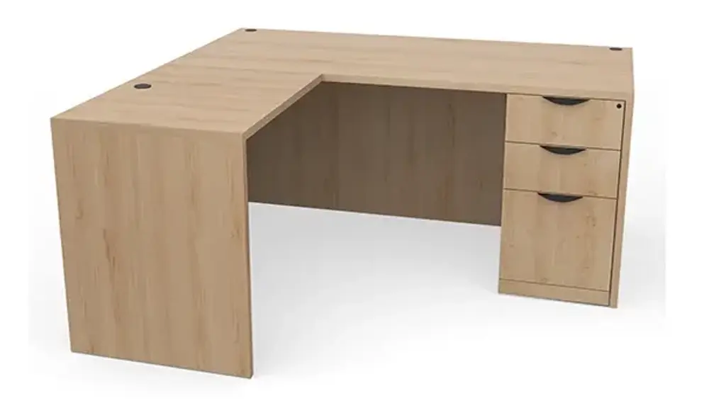 This Desk is Reversible PL Series L Shaped Desk features a durable laminate finish. Desk features a full size box/box/file pedestal. Drawers lock for security. File drawer accommodates letter or legal size files. Available in several laminate colors. Ships ready for easy set up - pedestal ships fully assembled.