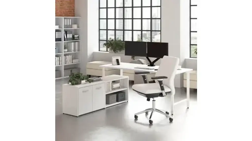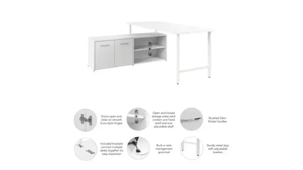 The Bush Business Furniture Hustle 72" W x 30" D Computer Desk and Low Storage Cabinet with Doors and Shelves provides the form and function needed to support your entrepreneurial spirit without breaking the bank. An ideal choice for small to medium-size businesses and home offices alike, each modern desk includes a bracket that allows for workstations to connect as your needs evolve and expand. Spread out with materials and equipment on a durable work surface with built-in wire management and a weight capacity of 200 pounds. The large office desk's thermally fused laminate finish fends off scratches, stains, and other cosmetic damage that occurs from daily use in a busy professional environment. The office storage cabinet's open and closed compartments each include one fixed shelf and one adjustable shelf to accommodate everything from books and reference materials to decorations. Each shelf supports up to 50 pounds, so storing and displaying larger items is never an issue. The surface of the storage credenza can be used as a practical place to keep a small printer and other equipment or to give your workspace a personal touch with pictures, plants and more. This computer table desk with storage cabinet has been meticulously designed and tested to meet or exceed ANSI/BIFMA quality standards for safety, durability, and performance. American made with U.S. and imported parts. Overall Dimensions: 71.02" W x 88.54" D x 30.07" H. Ships ready for easy asswembly.
