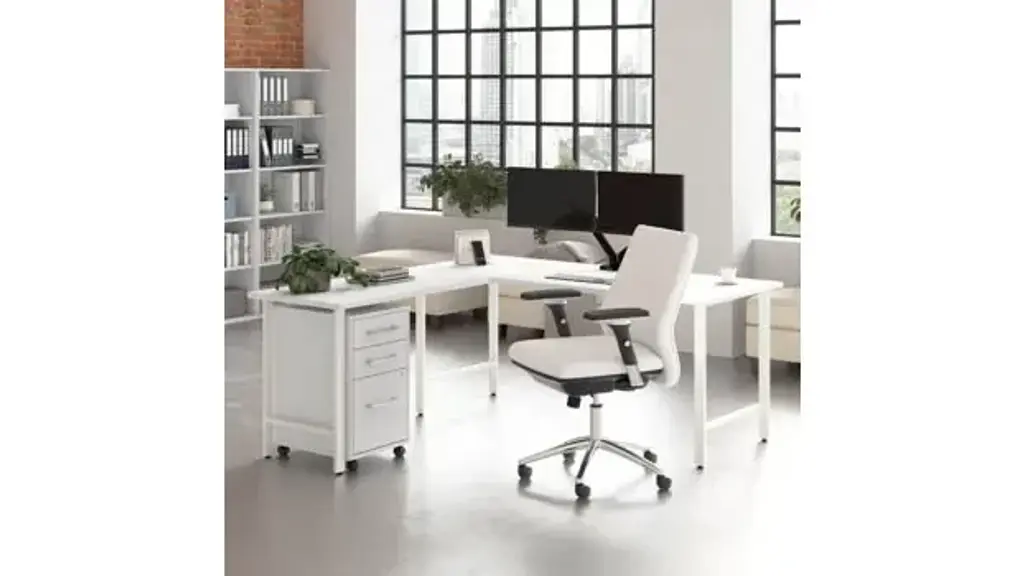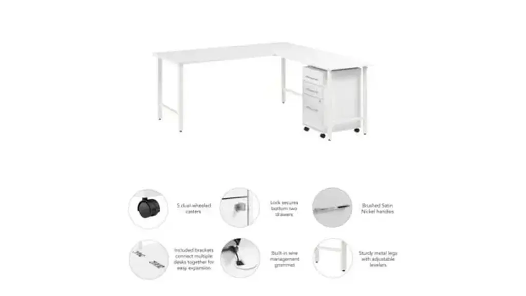 The Bush Business Furniture Hustle 72" W x 30" D L-Shaped Computer Desk with 3 Drawer Mobile File Cabinet provides the form and function needed to support your entrepreneurial spirit without breaking the bank. An ideal choice for small to medium-size businesses and home offices, each modern desk includes a bracket that allows for workstations to connect as your needs evolve. Spread out with materials and equipment on a durable work surface with built-in wire management and a weight capacity of 200 pounds. The L-shaped office desk's thermally fused laminate finish fends off scratches, stains, and other cosmetic damage that occurs from daily use in a busy professional environment. The small filing cabinet rolls effortlessly throughout your workspace to provide storage where it's needed most. Its bottom drawer opens on full-extension ball bearing slides for easy access to letter, legal, and A4-size paperwork while two box drawers organize writing utensils and other small office supplies. Drawers can be locked to safeguard documents with sensitive information as well as valuable items. The rolling file cabinet's compact design allows it to fit conveniently below the work surface to provide under desk storage. This corner desk with drawers has been meticulously designed and tested to meet or exceed ANSI/BIFMA standards for safety, durability, and performance. American made with U.S. and imported parts. Overall Dimensions: 71.02" W x 71.33" D x 30.07" H. Mobile File Cabinet Dimensions: 15.67" W x 19.69" D x 30.07" H Ships ready for easy assembly.