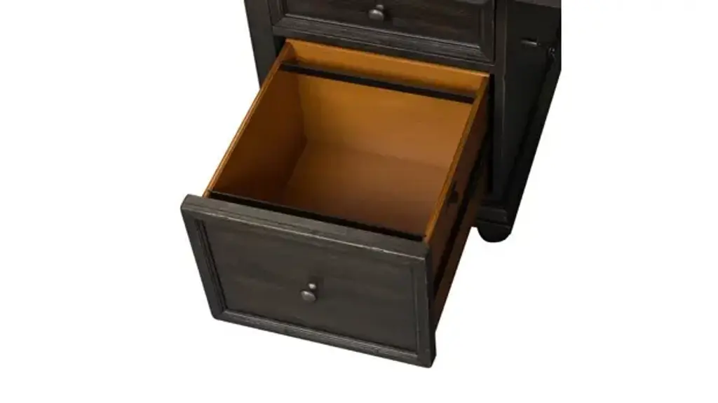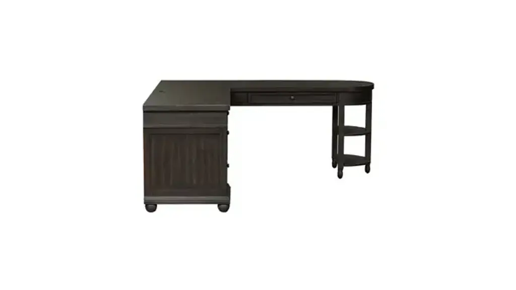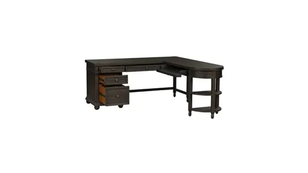Work from home in comfort and style with the Harvest Home L shaped desk set. Crafted of rubberwood solids with knotty white oak veneers, this desk features a chalkboard finish with saw cut hewing, L-Shaped Desk has 5 interior storage drawers, including two flip down keyboard drawers and a locking file drawer, bottom case dust proofing to protect contents, and additional storage with the shelving at the end of the curved shape return. This set effortlessly creates a casual look with a classic feel. With today's modern technology in mind, this set features a built-in charging station with two plugs and two USB ports, making multi device charging a breeze. Overall Dimensions: 70" W x 74.80" D x 36.76" H. Ships ready for easy setup.