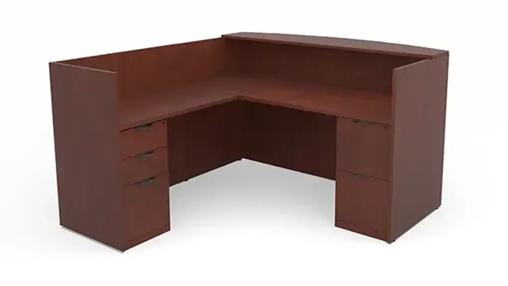 This Desk is Reversible PL Series L-Shaped reception desk has a durable laminate finish. Full height reception desk provides over 11 inches of privacy walls above the work surface. L-Shaped Reception Desk includes 3 grommets - 1 in each corner of the main desk and 1 centered on the back of edge of the return side. Hanging and locking Box File drawer pedestal included. Available in several laminate finishes. Laminate transaction counter. Ships ready for easy assembly.