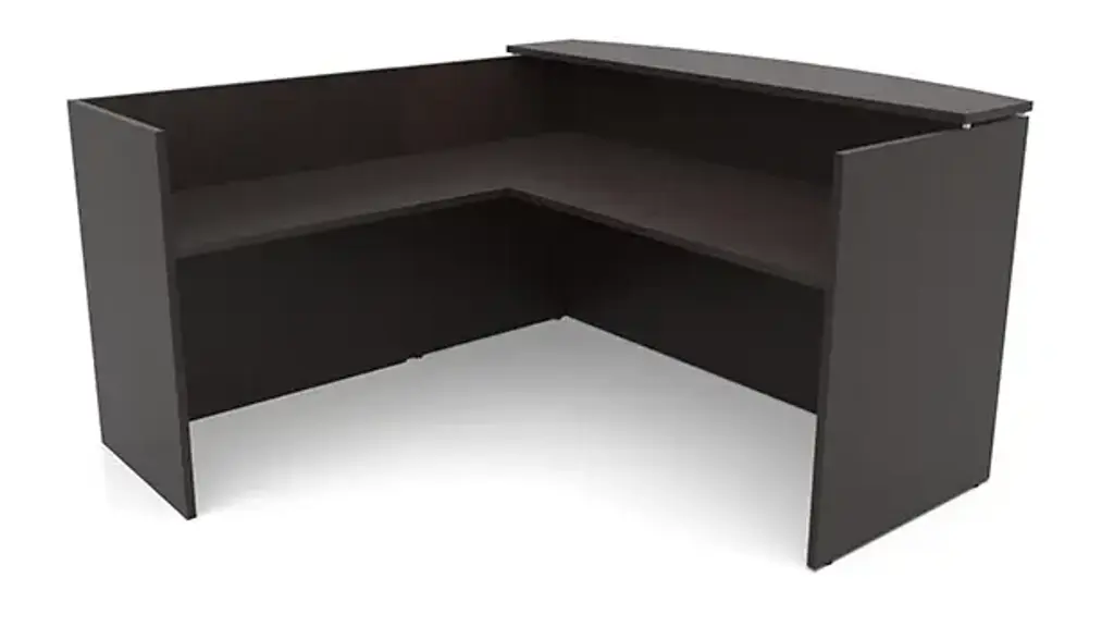 This Desk is Reversible PL Series L-Shaped reception desk has a durable laminate finish. Full height reception desk provides over 11 inches of privacy walls above the work surface. L-Shaped Reception Desk includes 3 grommets - 1 in each corner of the main desk and 1 centered on the back of edge of the return side. Available in several laminate finishes. Laminate transaction counter. Full height locking box box file drawer pedestal. Ships ready for easy assembly.