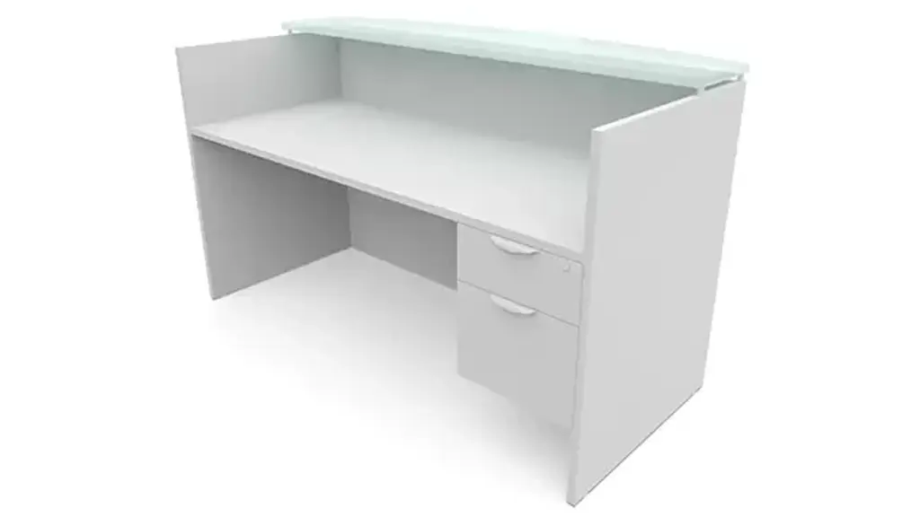 This Desk is Reversible PL Series reception desk has a durable laminate finish.  Full height reception desk provides over 11" of privacy walls above the work surface. Reception Desk includes 2 grommets - 1 in each corner of the desk.  Available in several laminate finishes.  Tempered glass transaction counter.  Full height locking box box file drawer pedestal.  Full height locking file file drawer pedestal.  Ships ready for easy assembly, pedestals ship assembled.
