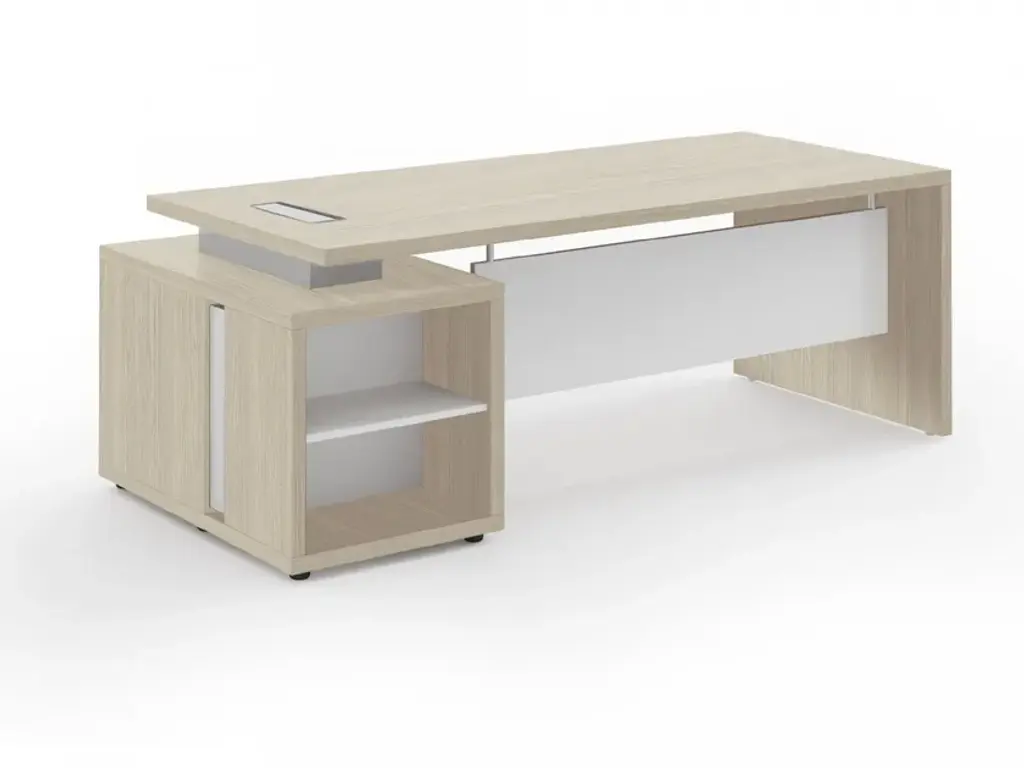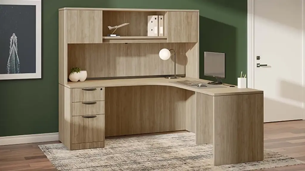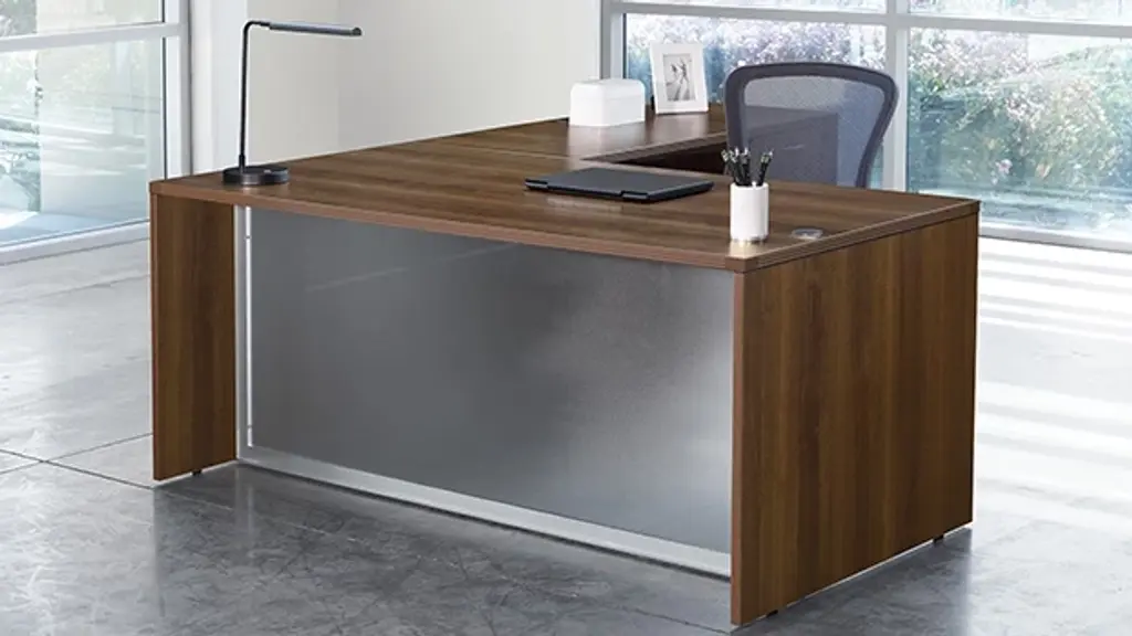 This step front double pedestal desk with glass front panel is a stylish and functional addition to any office. It is available in a variety of laminate colors to match any décor, and it is constructed with 1" thick tops and end panels for durability. The step front design adds a touch of elegance to the desk, and it requires some assembly for convenience. Includes two drawer pedestals both Box/Box/File providing you with ample storage. Ships ready for easy assembly.