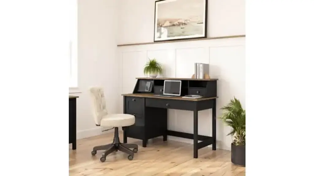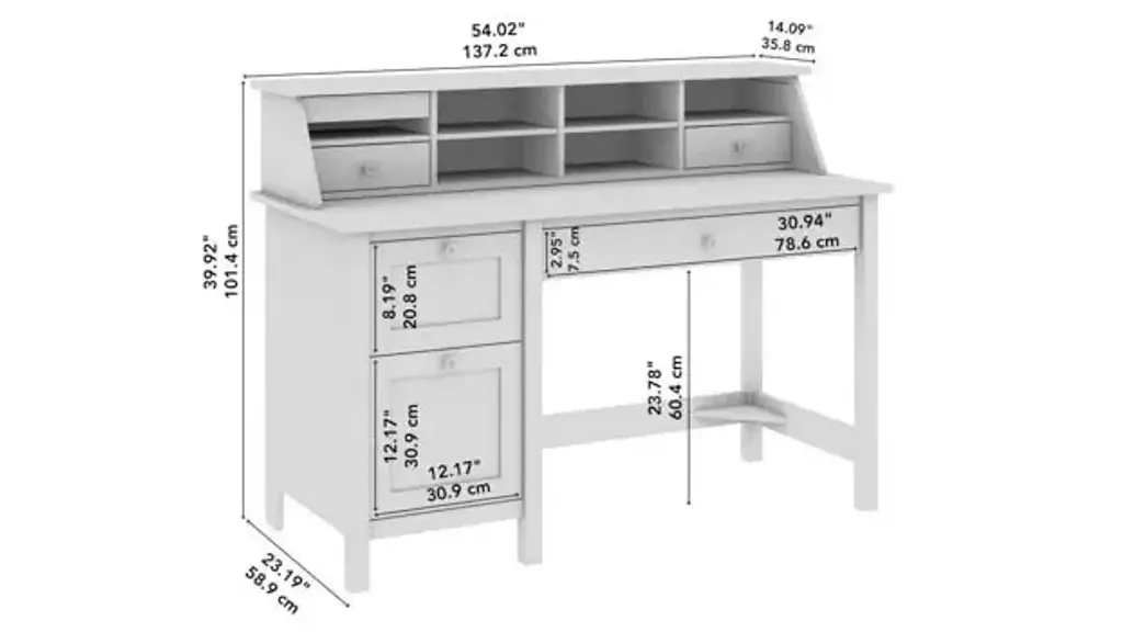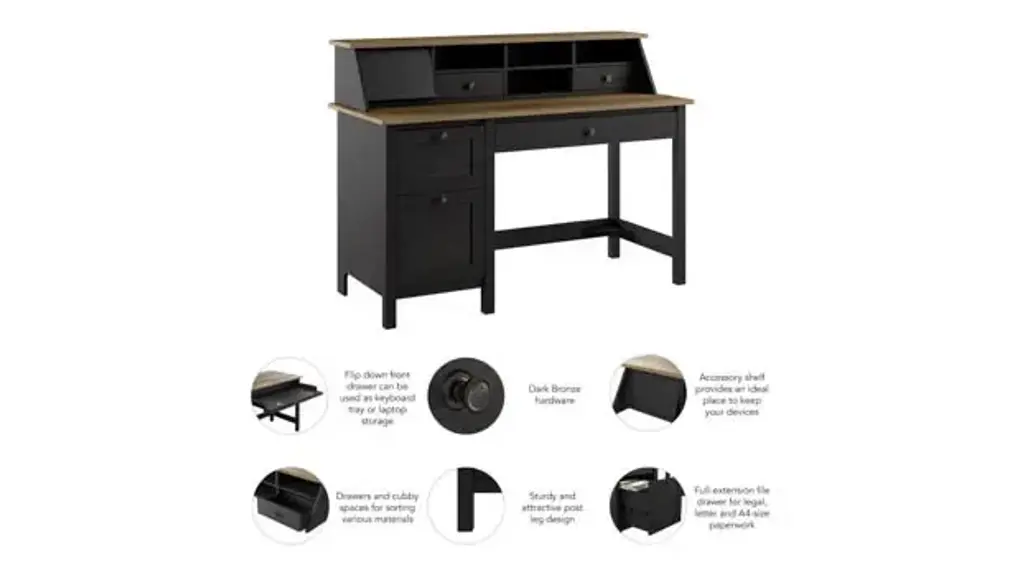 Stay on top of your daily tasks with a workspace that suits your casual home. Highlighted by its relaxed modern farmhouse style, the Bush Furniture Mayfield 54" W Computer Desk with Drawers and Desktop Organizer also includes plenty of practical features to keep you feeling productive. Spread out with all your materials on a durable work surface that supports a computer, books and more with a weight capacity of 200 lbs. A letter-size file drawer and a small box drawer ensure that the papers and office supplies you need are always within reach. A larger drawer pulls out to provide easy access to your keyboard or laptop and features a convenient flip down front that folds up neatly when not in use. The Desk Organizer adds eight cubby spaces with two pencil drawers that fit in any compartment for a custom configuration. A pull-out accessory shelf offers an ideal place to keep your phone or tablet and can be installed on whichever side you prefer. Dark Bronze drawer pulls complement the writing desk's two-tone finish for an easy going style you're sure to love. This farmhouse desk with storage is tested to meet ANSI/SOHO quality standards for safety and performance. See the full collection for coordinating items available. Overall Dimensions: 54.02"W x 23.19"D x 39.92"H. Ships ready for easy assembly.