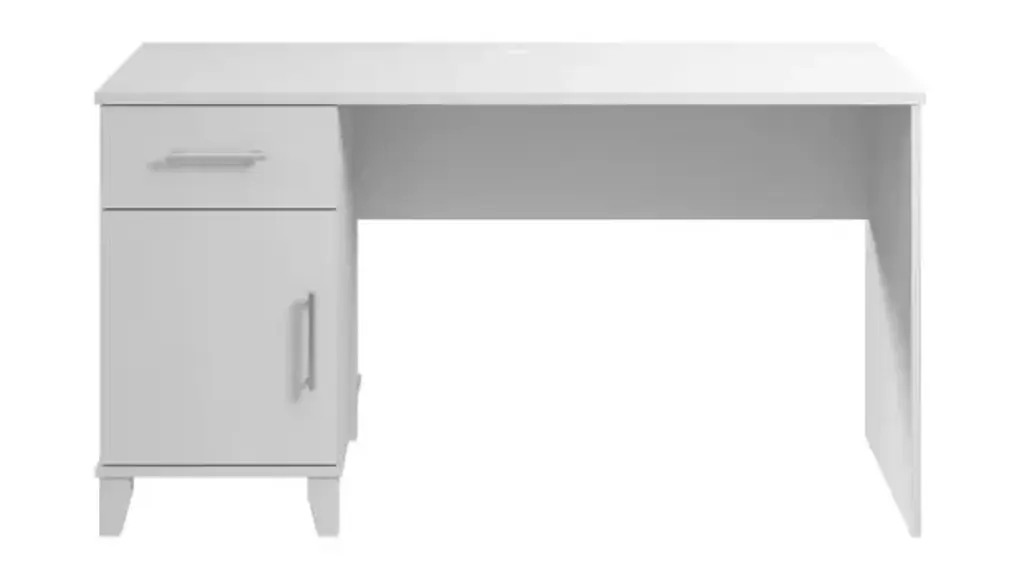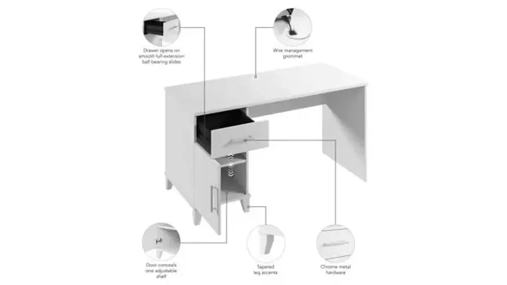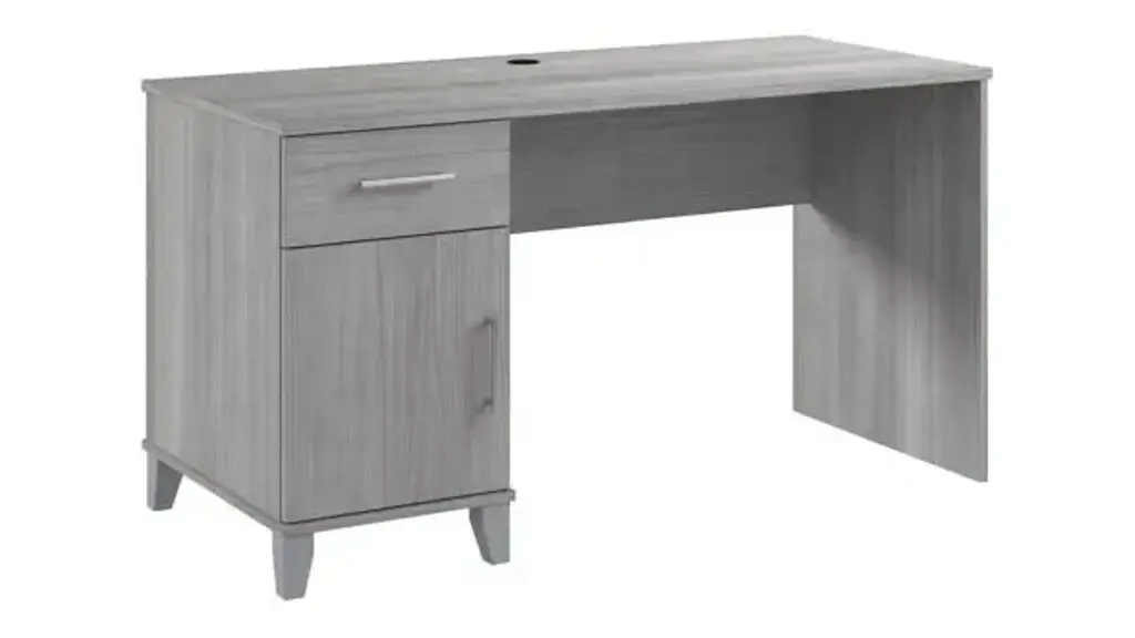 A spacious work surface and built-in storage make the Bush Furniture Somerset 54" W Office Desk with Drawer and Storage Cabinet a perfect choice for your home office. The desktop offers plenty of room to spread out with a computer and paperwork and includes a convenient wire management grommet to keep cords and cables secure and out of sight. Durable desktop supports a computer, books and more with a 200 lb weight capacity. The desk’s box drawer opens on smooth full-extension ball-bearing slides for easy access to office supplies and utensils you need close by, while the enclosed storage cabinet with door and adjustable shelf effortlessly conceals your personal items. Reversable storage is perfect for a unique and custom configuration, and a fully finished back side allows the desk to look great no matter where it’s positioned in the room. Somerset’s transitional styling includes your choice of several attractive finish options with tapered leg accents and contemporary metal hardware for an appealing look that works with virtually any decor. The 54" W Office Desk with Drawer and Storage Cabinet is tested to meet ANSI/SOHO quality standards for safety and performance. See the full collection for products to expand your home or small office with sophisticated style. North American made with globally sourced materials. Overall Dimensions: 53.98" W x 24.52" D x 29.11" H. Ships ready for easy assembly.