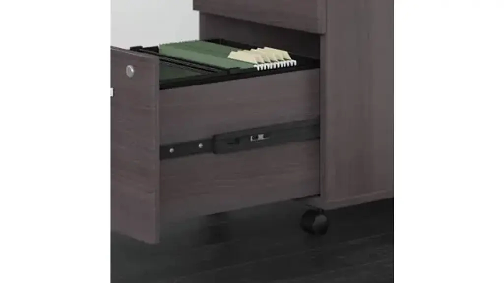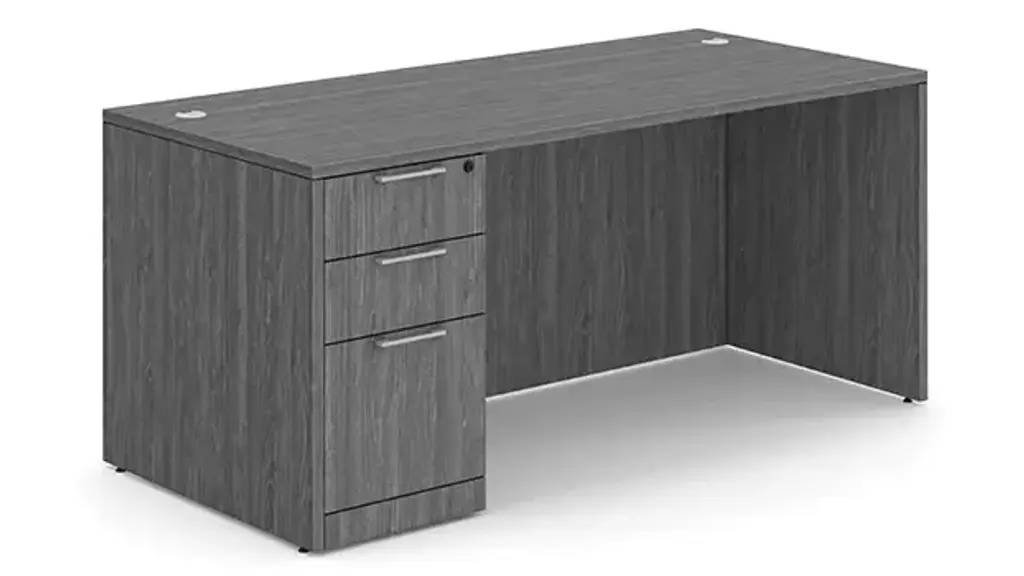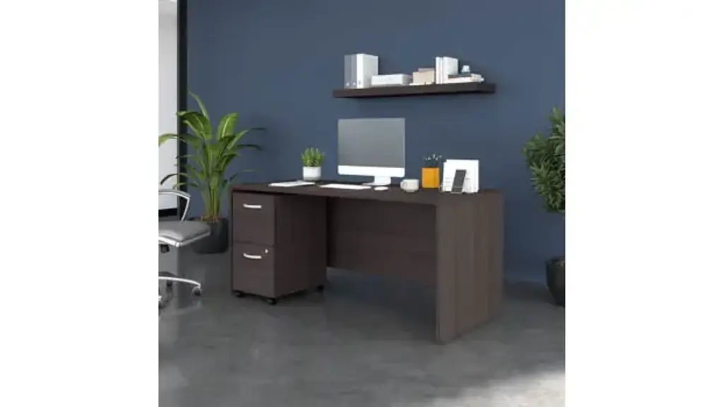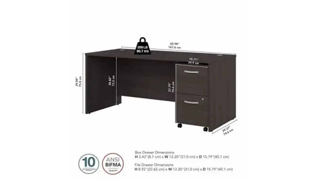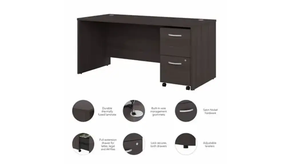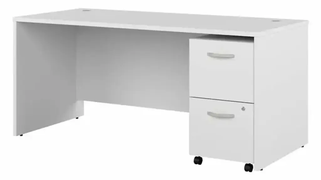 Bush Business Furniture Studio C 66" W x 30" D Office Desk with 2 Drawer Mobile File Cabinet offers a stylish, long-lasting workspace solution for today's professionals. A thick surface, an extended modesty panel and clean lines convey a classic look that will fit any workspace. The thermally fused laminate finish, durable edge banding and sturdy end panels resist scratches, stains and dents while standing up to the rigors of a 40-plus hour work week. Keep pesky computer cords out of your way with the integrated cable management system for an organized work surface. You'll have your letter, legal and A4-size paperwork organized in no time as the Mobile File Cabinet ships fully assembled for your convenience. Both drawers open on full-extension ball-bearing slides, making it easy to reach those pesky files all the way at the back. Dual-wheeled, hooded casters keep the 2 drawer cabinet moving wherever you want or remain in place on your office floor or carpet. A single lock secures both drawers to keep your paperwork private. When space is at a premium, the Mobile File Cabinet conveniently fits under your desk. Eye-catching Brushed Nickel drawer pulls complement your choice of finish to make the cabinet as attractive as it is functional. This computer desk set meets ANSI/BIFMA quality test standards for safety and performance. American made with globally sourced materials. Overall Dimensions: 65.98" W x 29.37" D x 29.84" H. Ships ready for easy assembly, file cabinet ships fully assembled.