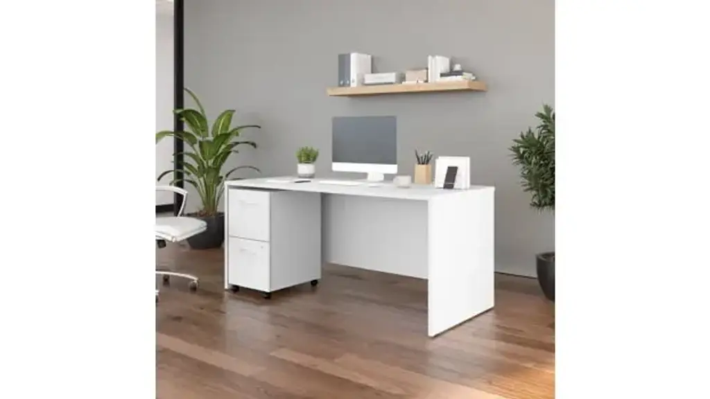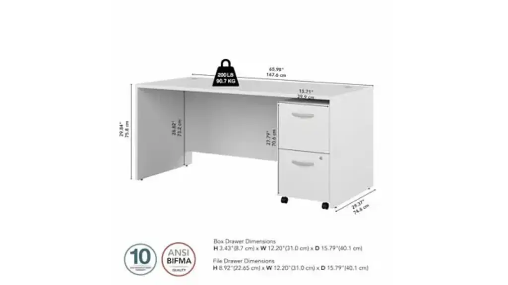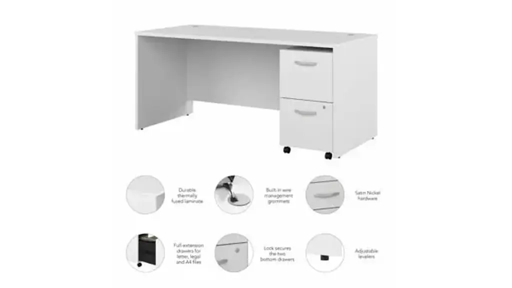 Bush Business Furniture Studio C 66" W x 30" D Office Desk with 2 Drawer Mobile File Cabinet offers a stylish, long-lasting workspace solution for today's professionals. A thick surface, an extended modesty panel and clean lines convey a classic look that will fit any workspace. The thermally fused laminate finish, durable edge banding and sturdy end panels resist scratches, stains and dents while standing up to the rigors of a 40-plus hour work week. Keep pesky computer cords out of your way with the integrated cable management system for an organized work surface. You'll have your letter, legal and A4-size paperwork organized in no time as the Mobile File Cabinet ships fully assembled for your convenience. Both drawers open on full-extension ball-bearing slides, making it easy to reach those pesky files all the way at the back. Dual-wheeled, hooded casters keep the 2 drawer cabinet moving wherever you want or remain in place on your office floor or carpet. A single lock secures both drawers to keep your paperwork private. When space is at a premium, the Mobile File Cabinet conveniently fits under your desk. Eye-catching Brushed Nickel drawer pulls complement your choice of finish to make the cabinet as attractive as it is functional. This computer desk set meets ANSI/BIFMA quality test standards for safety and performance. American made with globally sourced materials. Overall Dimensions: 65.98" W x 29.37" D x 29.84" H. Ships ready for easy assembly, file cabinet ships fully assembled.