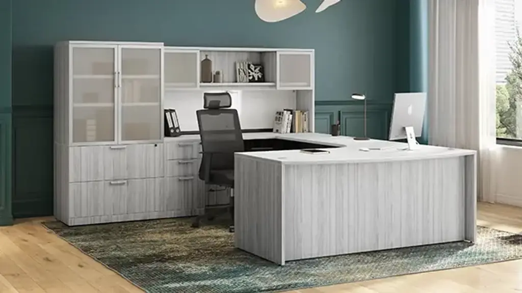 This Desk is Reversible OS Select Collection U-Shaped Bow Front Desk with 4 laminate door hutch features a durable laminate finish. Includes a full size box/box/file and full size file/file pedestal. Drawers lock for security. File drawers accommodate legal or letter size files. Ships ready for easy set-up, pedestals ship fully assembled.