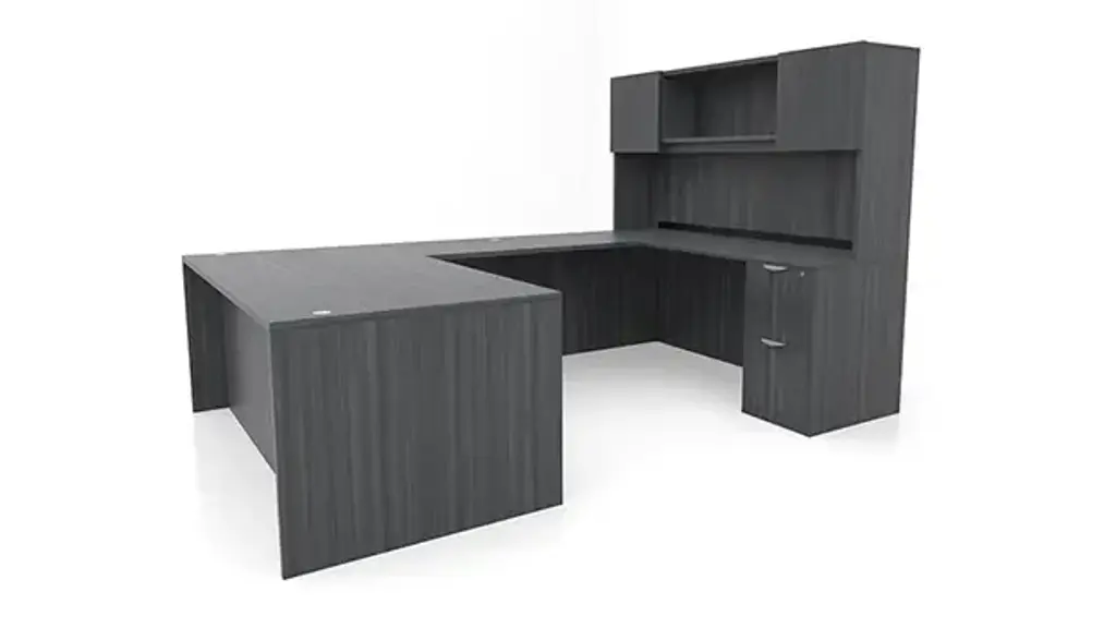 This Desk is Reversible PL Series Bow Front Double Pedestal U-Shaped Desk with open hutch features a durable laminate finish.  Bow Front provides you with extra desk space and allows guests to pull up and work with you.  Desk features a full size File / File Pedestal and Box / Box File.   Drawers lock for security.  File drawers accommodates letter or legal size files. Open Hutch can be used for display or to keep binders and documents accessible and organized. Available in several laminate finishes.  Ships ready for easy set up - pedestals ship fully assembled.