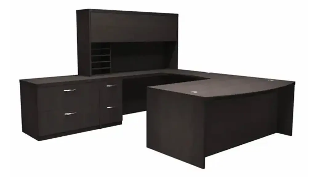 This Desk is Reversible U-Shaped Desk with Hutch and 2 Drawer Pedestals for the Aberdeen Collection 72" Rectangular Desk with 1 5/8" thick work surface, full height, vertical grain, and modesty panel. 2 in-surface grommets standard, modesty panel recessed 8 1/2". Balances the look of wood with the performance and affordability of laminate. Ideal for private office or open-concept office space. Durable, abrasion and stain-resistant surfaces. Built in grommets for easy power connection. Variety of desk options and matching bookcase, hutch, bridge, return, and extended corner pieces available. Desk Pedestals: Pencil/Box/Box/File and File/File Integrated cable management at top and bottom, unfinished top must be attached to underside of the desk. Dual-purpose pencil drawer, locks keyed alike, removable lock cores. Curved metal pulls with brushed nickel finish accommodates letter or legal size hanging file folders. Pedestal ship fully assembled. Credenza has a 1-5/8" thick work surface with fluted rim, full height vertical grain modesty panel and recessed modesty panel with grommet and mouse hole for cable pass-through. 72" Hutch with glass doors has textured glass for privacy and to highlight contents. Four self-closing cabinet style doors and back panel with 2 cable grommets. Hutch as 21-1/2" clearance between work surface and bottom shelf. Ships ready for easy assembly.