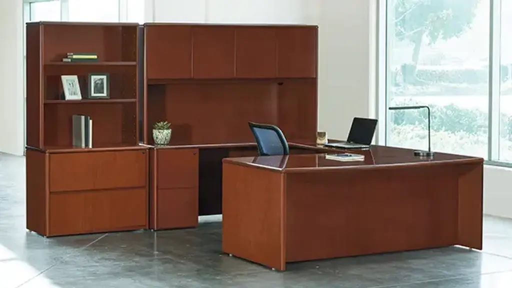 This Desk is Reversible Sonora collection furniture features radius edges and all hardwood and veneer construction. Each piece is stained to a wonderful dark cherry color and sealed in a multi step process to proceed a medium sheen finish. The 72" x 39" bow front desk, return and credenza all have 1-1/8" thick durable top to create a stately looking office. Bridge is 48"w x 24"d. Complete U-Desk is 72" x 107". Combo unit extends to 108". Double pedestal desk includes a box/box/file and file/file pedestal, both locking. Bridge is reversible and can be assembled for use on the left or right side of the desk. Pedestals and lateral ships fully assembled. Lateral file and display hutch can be used as stand alone combo or extend the back wall of your hutch. Desk shell is ready for easy assembly.