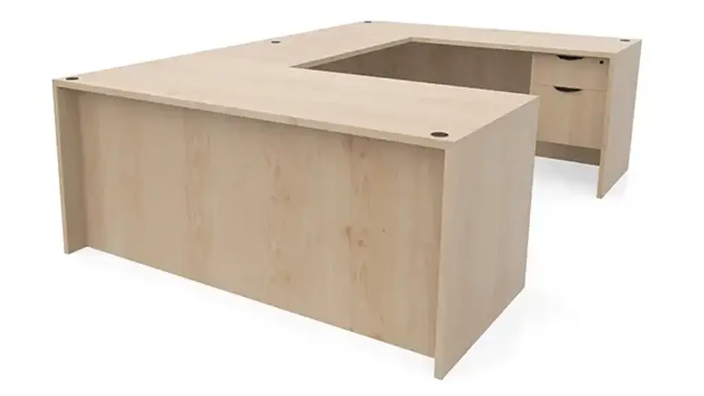 This Desk is Reversible PL Series Bow Front Double Pedestal U-Shaped Desk features a durable laminate finish. Bow Front provides you with extra desk space and allows guests to pull up and work with you. Desk features a full size File / File Pedestal and Box / Box File. Drawers lock for security. File drawers accommodates letter or legal size files. Available in several laminate finishes. Ships ready for easy set up - pedestal ships fully assembled.