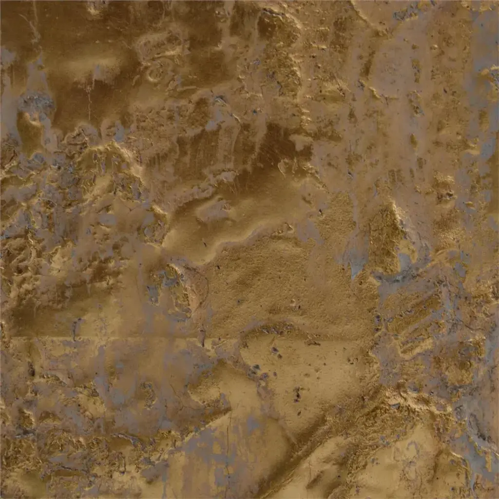A modern pedestal with a molten resin pattern in gold leaf is paired with a glass top.
