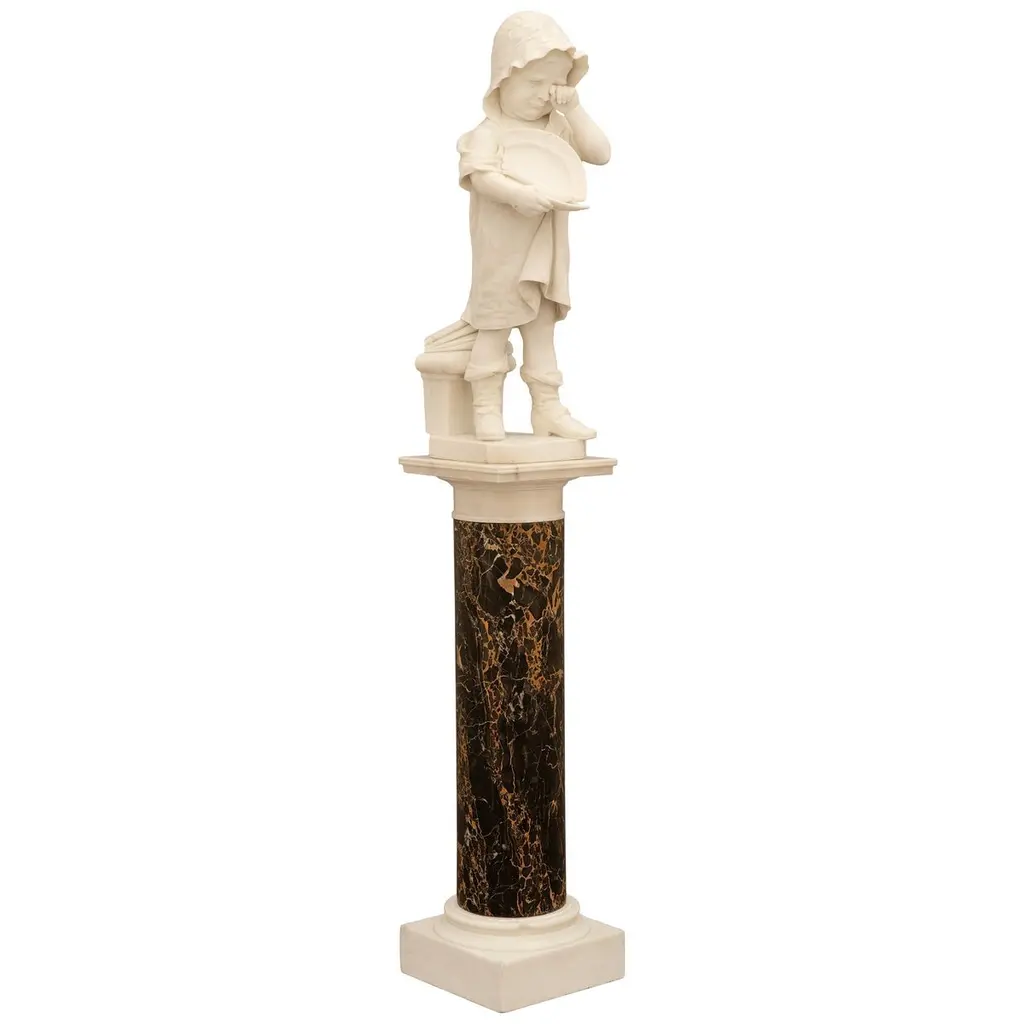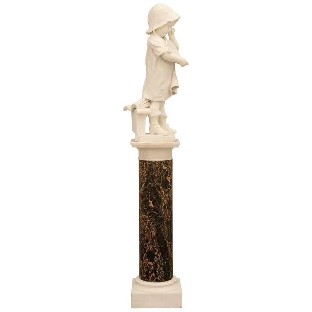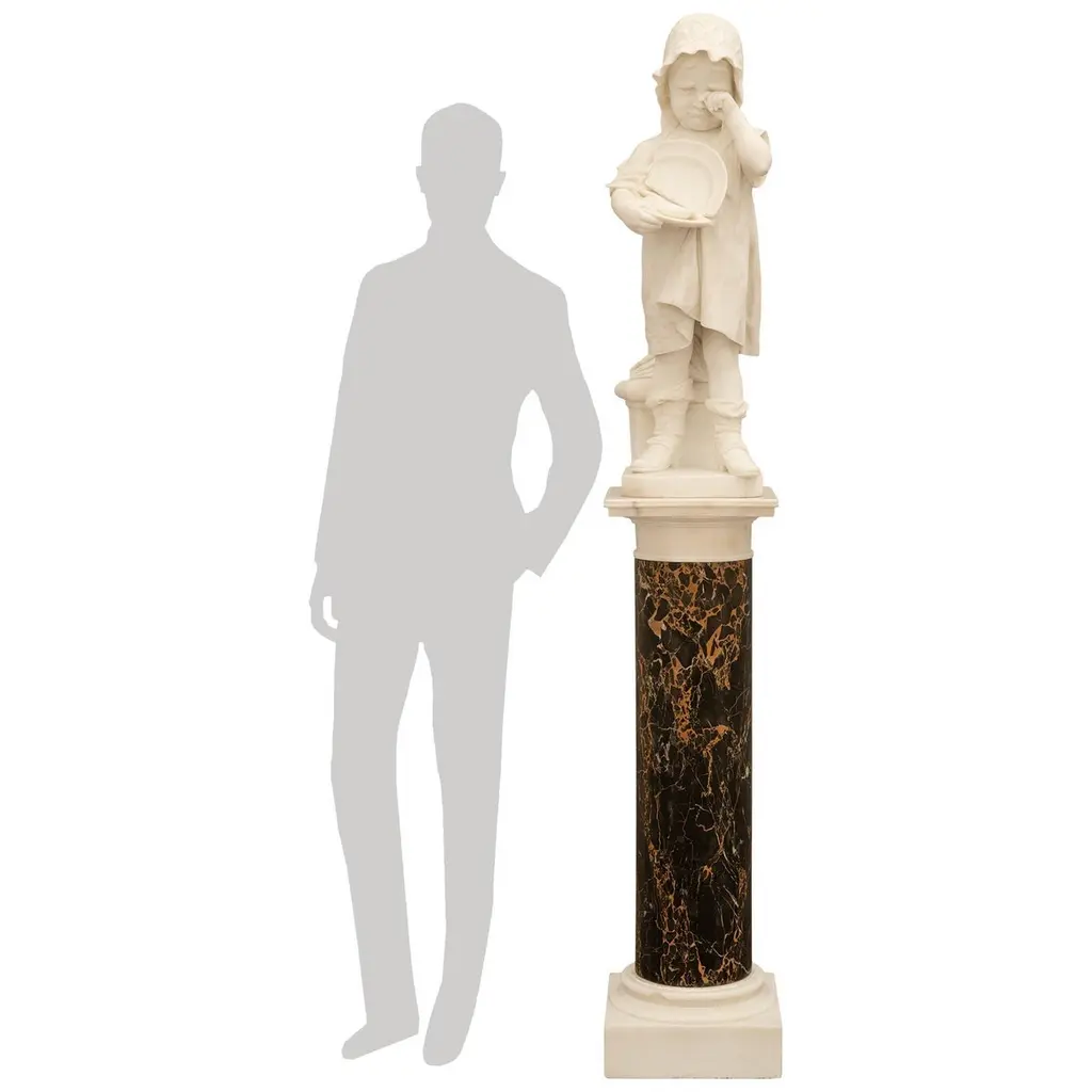An adorable and finely detailed Italian 19th century White Carrara marble statue and Portoro marble pedestal, signed 'Galli Firenza', circa 1885. This emotional and high quality marble sculpture, entitled "The Broken Plate", depicts a young little girl wiping her tears as she cries due to dropping her plate of pasta. Her plate is broken in her hands with only a few fettuccine noodles hanging over the side of the spoon and plate. This young girl is standing in front of a step with an open book on top, appearing to have been sitting before the crashing of the plate. She is dressed in low cut strapped shoes with loose fitting socks, a large flowing dress hanging off her right shoulder, and a cute bonnet with a beautifully patterned trim. This wonderful statue is raised on a Portoro marble pedestal with a square mottled edge white Carrara marble plinth and capital.Statue Dimensions: H: 35.5" L: 11" D: 18"Pedestal Dimensions: H: 43.5" L: 13.75" D: 13.75"