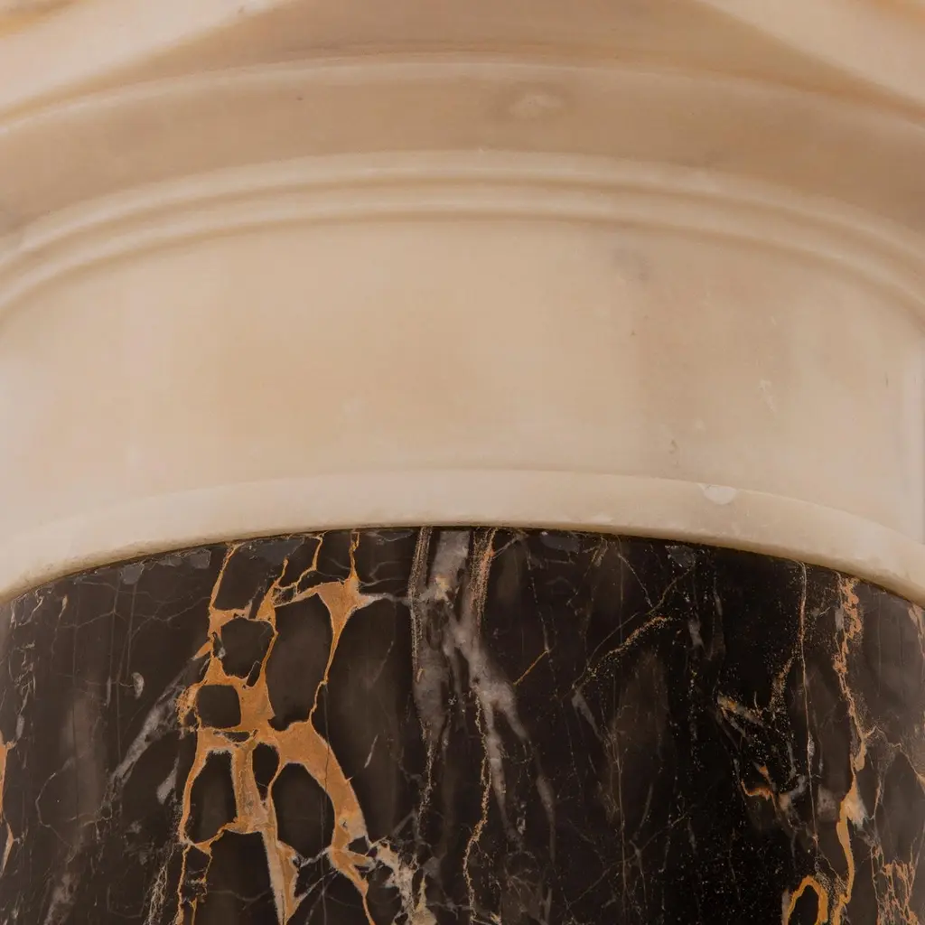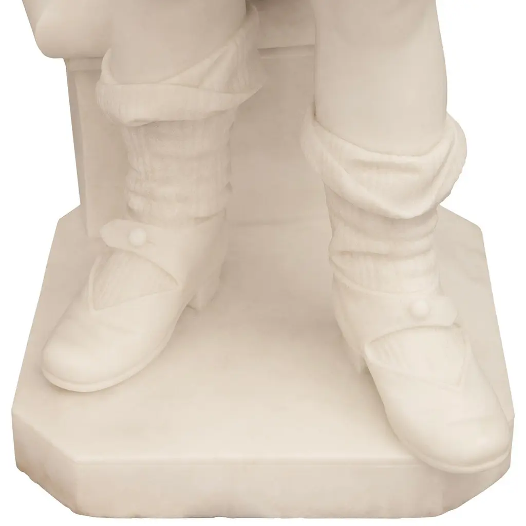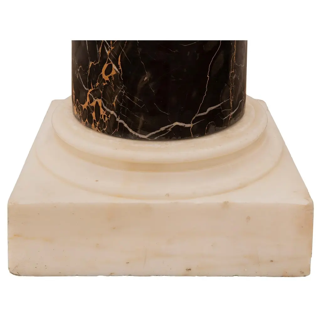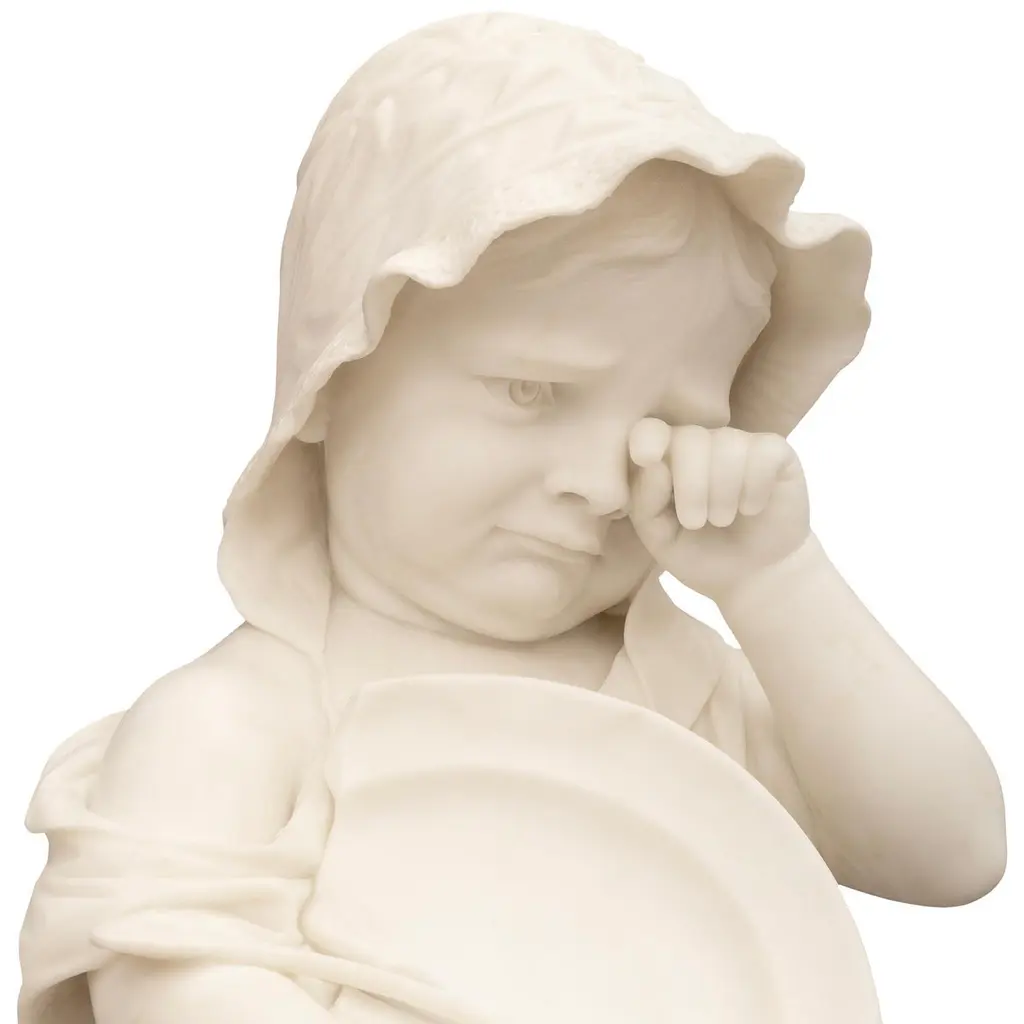 An adorable and finely detailed Italian 19th century White Carrara marble statue and Portoro marble pedestal, signed 'Galli Firenza', circa 1885. This emotional and high quality marble sculpture, entitled "The Broken Plate", depicts a young little girl wiping her tears as she cries due to dropping her plate of pasta. Her plate is broken in her hands with only a few fettuccine noodles hanging over the side of the spoon and plate. This young girl is standing in front of a step with an open book on top, appearing to have been sitting before the crashing of the plate. She is dressed in low cut strapped shoes with loose fitting socks, a large flowing dress hanging off her right shoulder, and a cute bonnet with a beautifully patterned trim. This wonderful statue is raised on a Portoro marble pedestal with a square mottled edge white Carrara marble plinth and capital.Statue Dimensions: H: 35.5" L: 11" D: 18"Pedestal Dimensions: H: 43.5" L: 13.75" D: 13.75"