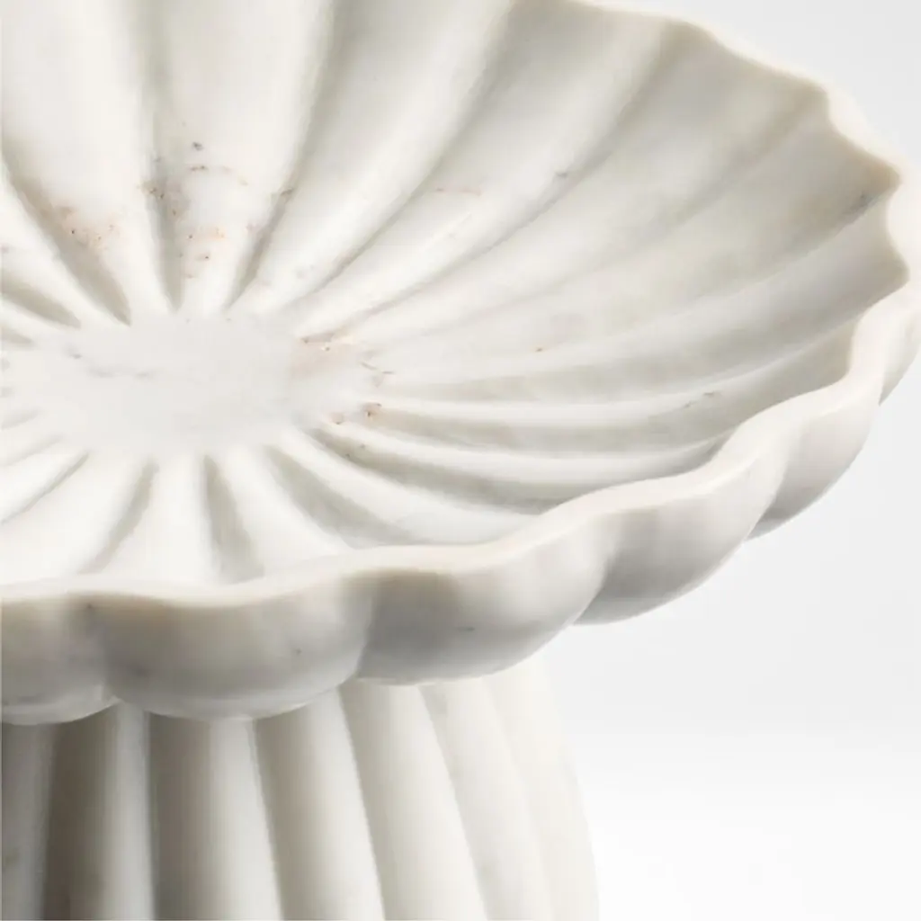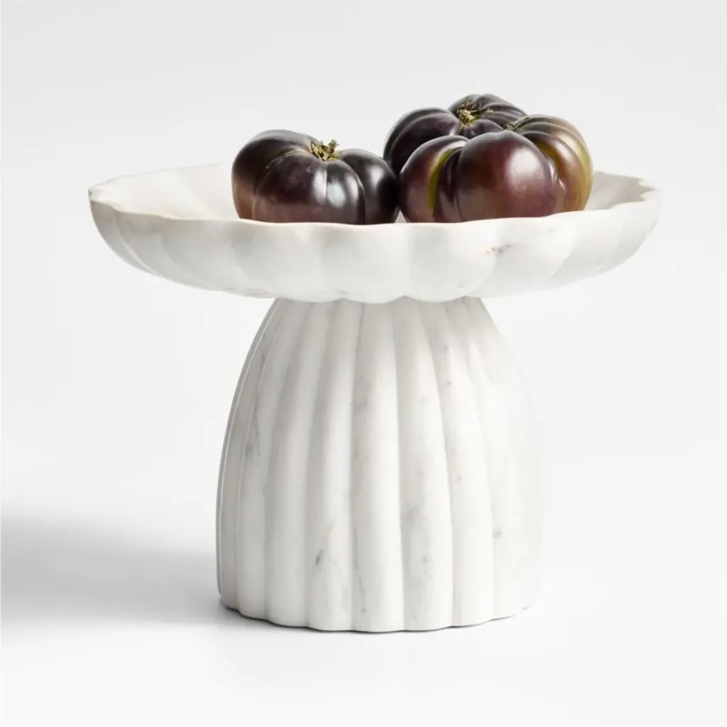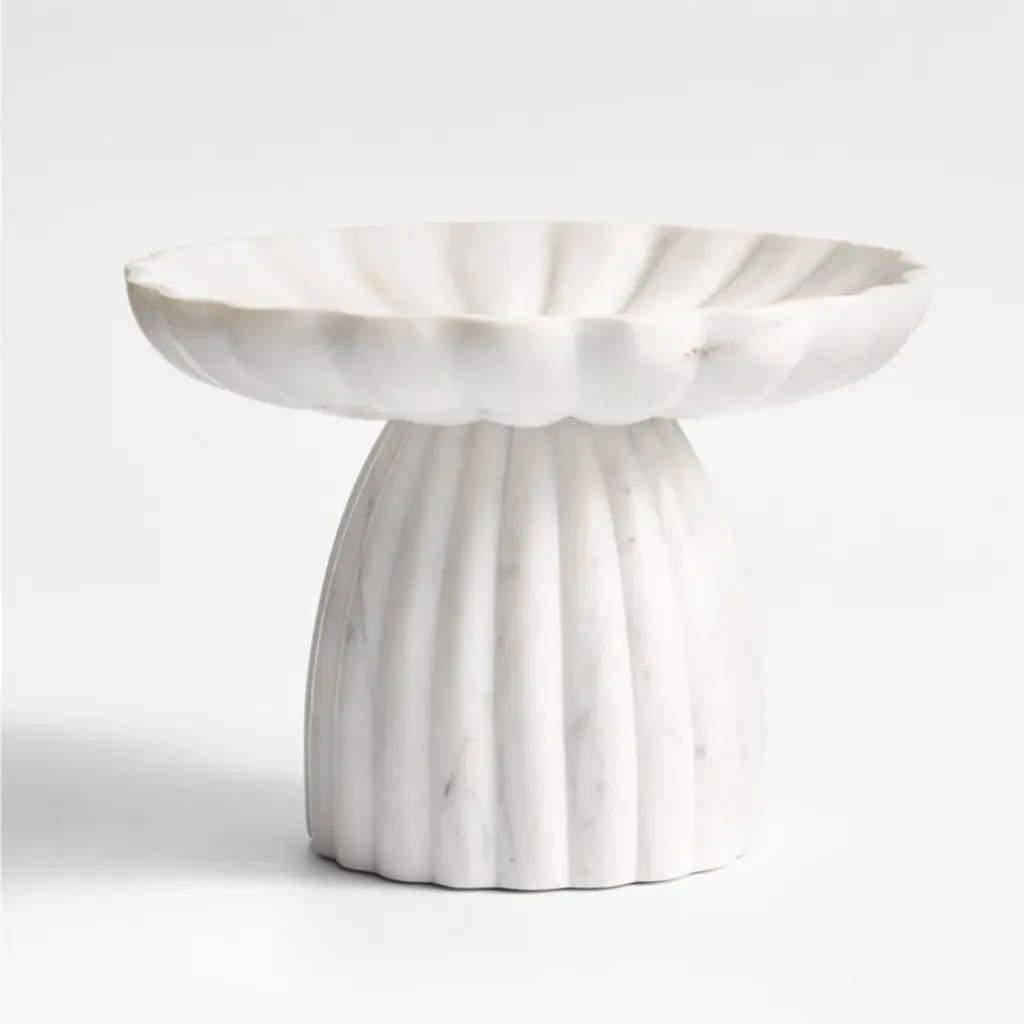 Our Jolie collection was designed with a classical look and modern versatility. Cut and polished by hand, the white marble pedestal plays on the aesthetic of a Doric column. We're especially obsessed with the way the ruffled bowl and fluted base animate the natural stone with soft shadows and highlights. The low, wide pedestal elevates everything from fresh fruit to bangles to pillar candles. Fascinating variations in the marble make each one unique.