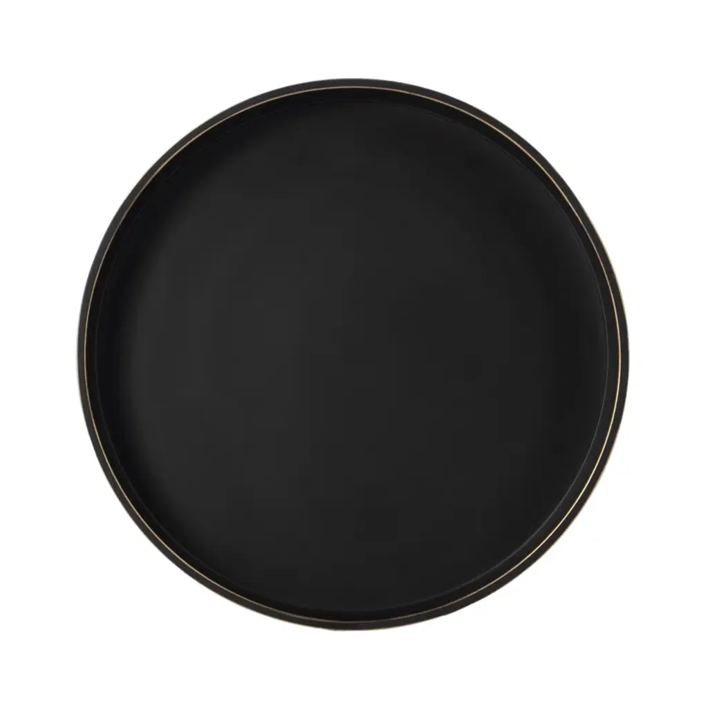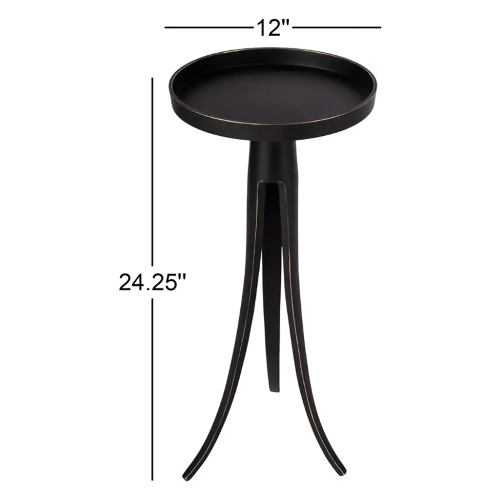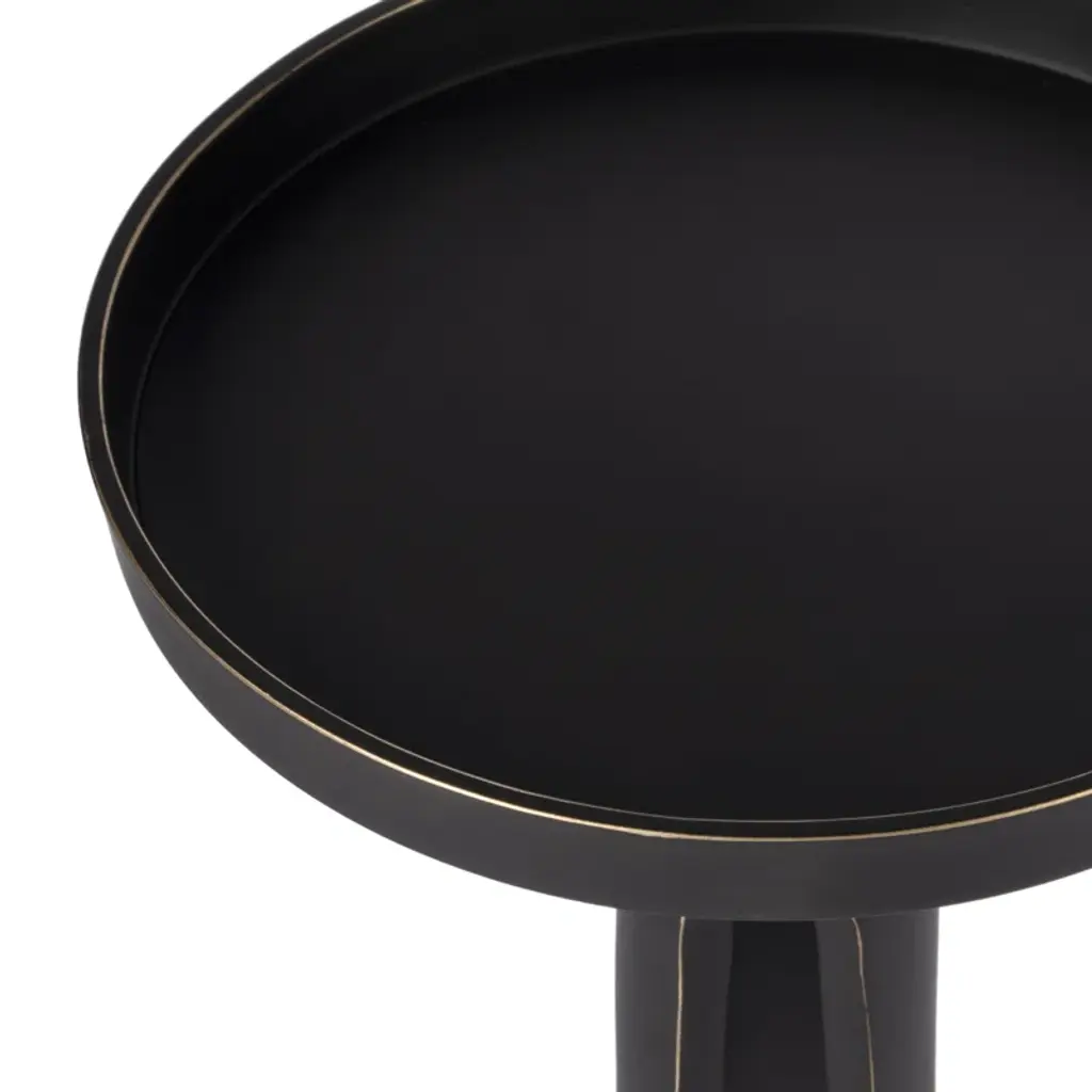 With a graceful tri-legged base, this side table is an elegant, yet understated addition in any space. The aluminum table features a satiny black finish with gold highlights along the edges. The round top has a raised gallery to help keep objects from sliding off the edge.