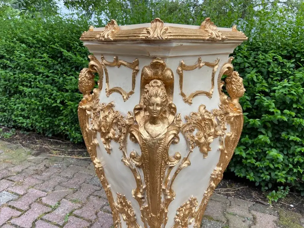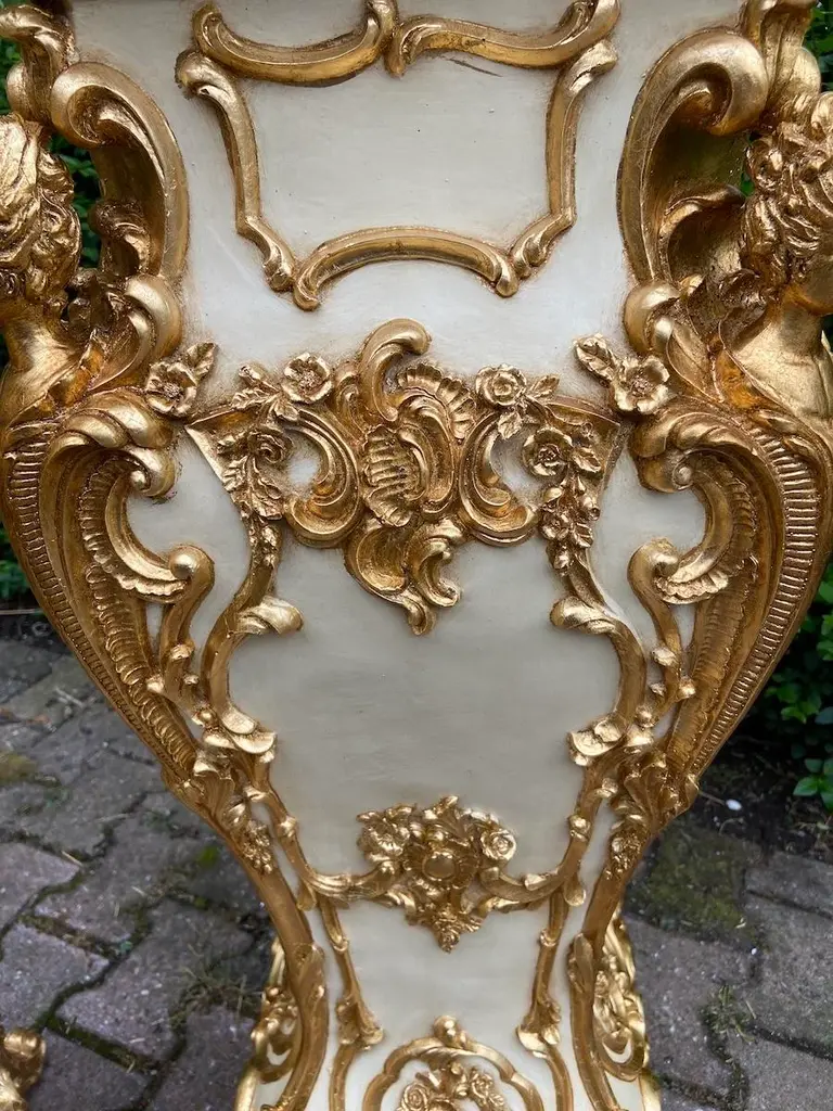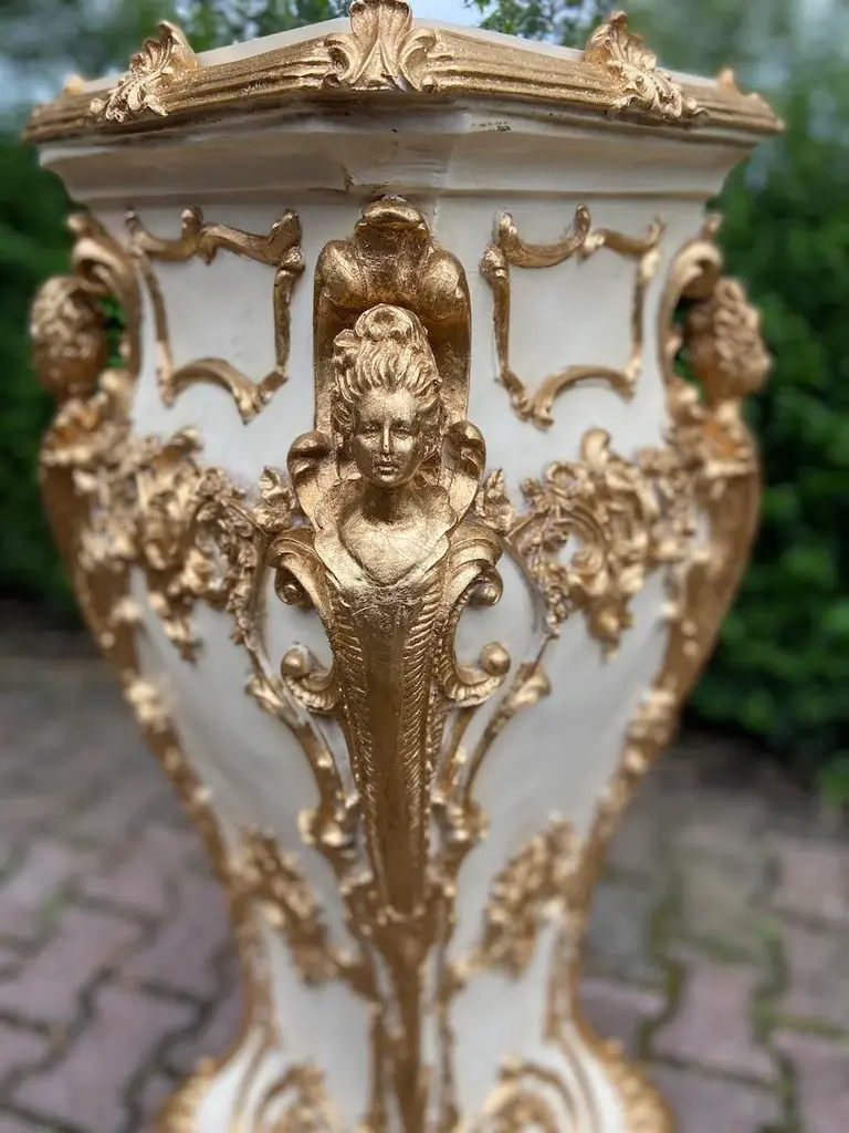 Late 20th-Century Italian Baroque-Style Pedestal – Cream, Gold & Marble-Effect Top Bring a touch of dramatic elegance to your space with this late 20th-century Italian Baroque-style pedestal, exquisitely crafted to echo the grandeur of Baroque and Rococo design. Finished in cream with gold highlights and topped with a light marble-effect surface, this pedestal serves as both a functional display piece and a decorative artwork in its own right. ✨ Design & Craftsmanship ✔ Baroque-Inspired Detailing The pedestal is adorned with finely sculpted female figures at each corner. Intricate carvings capture the ornamentation and theatricality of Baroque design. ✔ Luxurious Cream & Gold Finish Cream/white base accented with hand-applied antique gold highlights. Gilding emphasizes ornate carvings and creates striking visual contrast. ✔ Marble-Effect Top Features a light marble-effect resin top, both durable and decorative. Ideal for displaying sculptures, busts, vases, or floral arrangements. ✔ Resin Construction Made of high-quality resin, ensuring stability and longevity. Provides the look of carved stone and gilded wood without excessive weight. Dimensions (Approximate) Height: 33 in. (84 cm) Width: 9 in. (24 cm) Depth: 9 in. (24 cm) ✅ Condition Very good vintage condition (late 20th century). Minor wear consistent with age and gentle use. Gold detailing remains vibrant; marble-effect top well-preserved. Details Date/Period: Late 20th Century Maker/Brand: Italian Artisan (Unsigned) Style: Baroque / Rococo Revival Color: Cream/White with Gold Accents, Marble-Effect Top Material: Resin with Marble-Effect Resin Surface Category: Pedestals / Display Furniture # of Pieces: 1 (Single Pedestal) Shipping & Packaging Secure Professional Packaging – pedestal will be carefully wrapped for protection. Shipping – insured and tracked. Peace of Mind Delivery – Guaranteed safe arrival. Why This Pedestal Is Special ✔ Late 20th-century Italian Baroque-style pedestal. ✔ Rich cream and gold finish with ornate carved female figures. ✔ Marble-effect top perfect for sculpture, vases, or florals. ✔ Versatile use – hallways, foyers, galleries, or living rooms. ✔ Statement decorative accent that brings Baroque grandeur into modern homes. ✨ Elevate your interior with this Italian Baroque-style pedestal – a stunning blend of ornamentation, luxury, and functionality. ✨