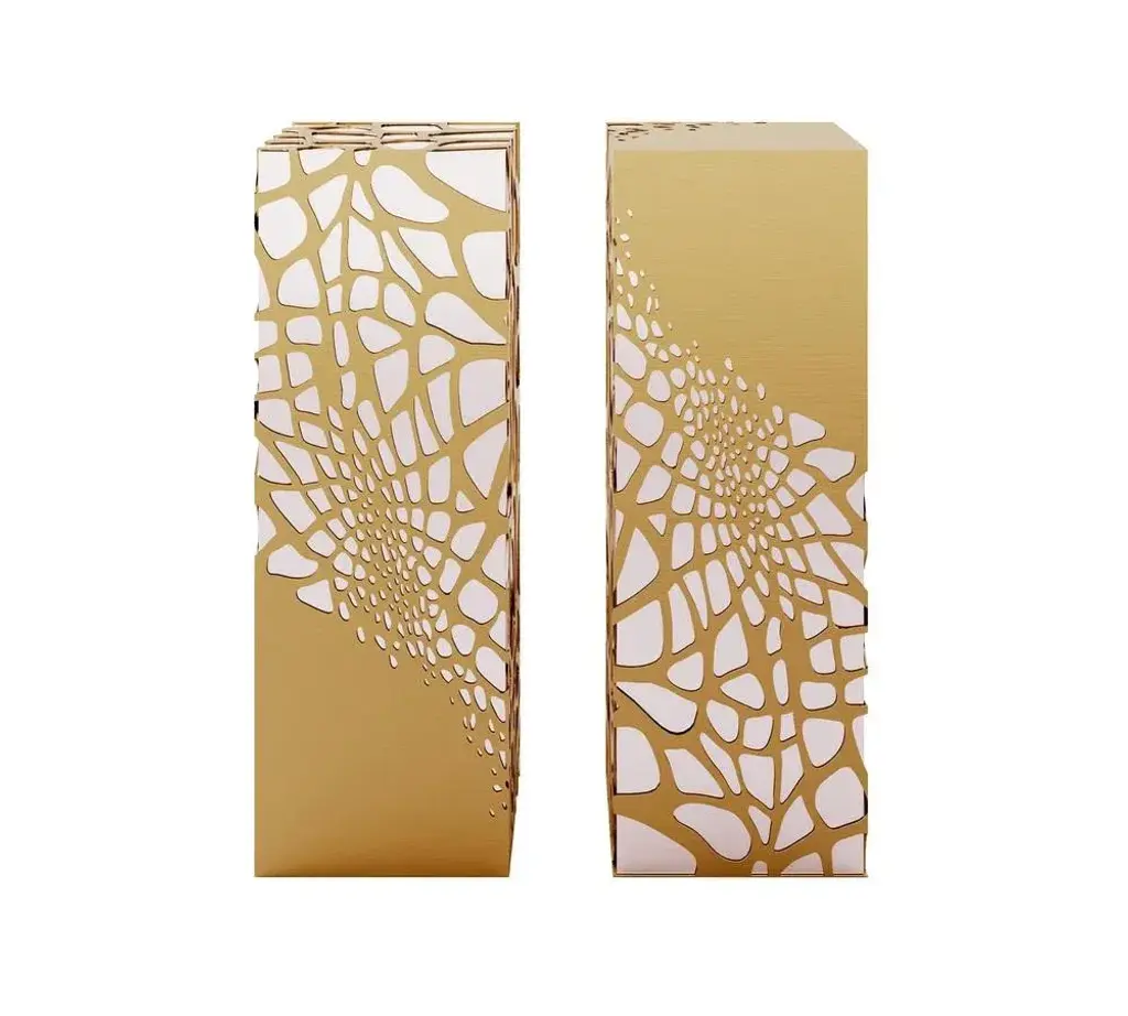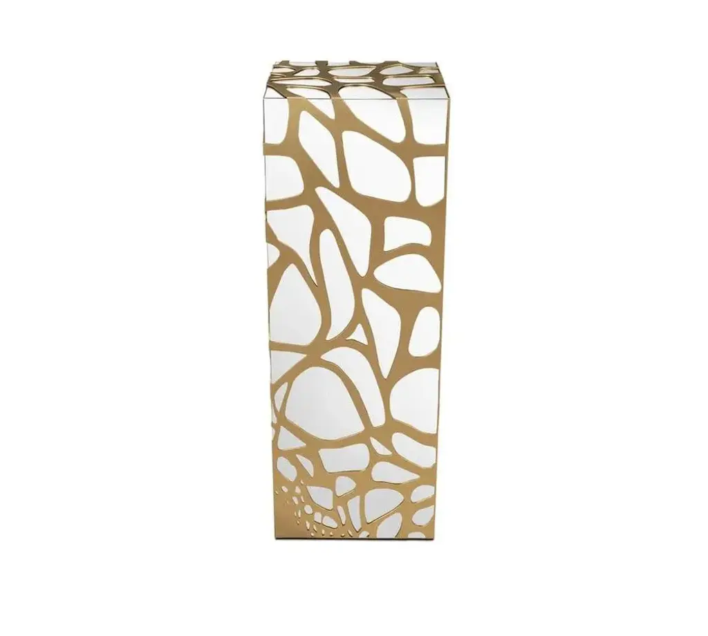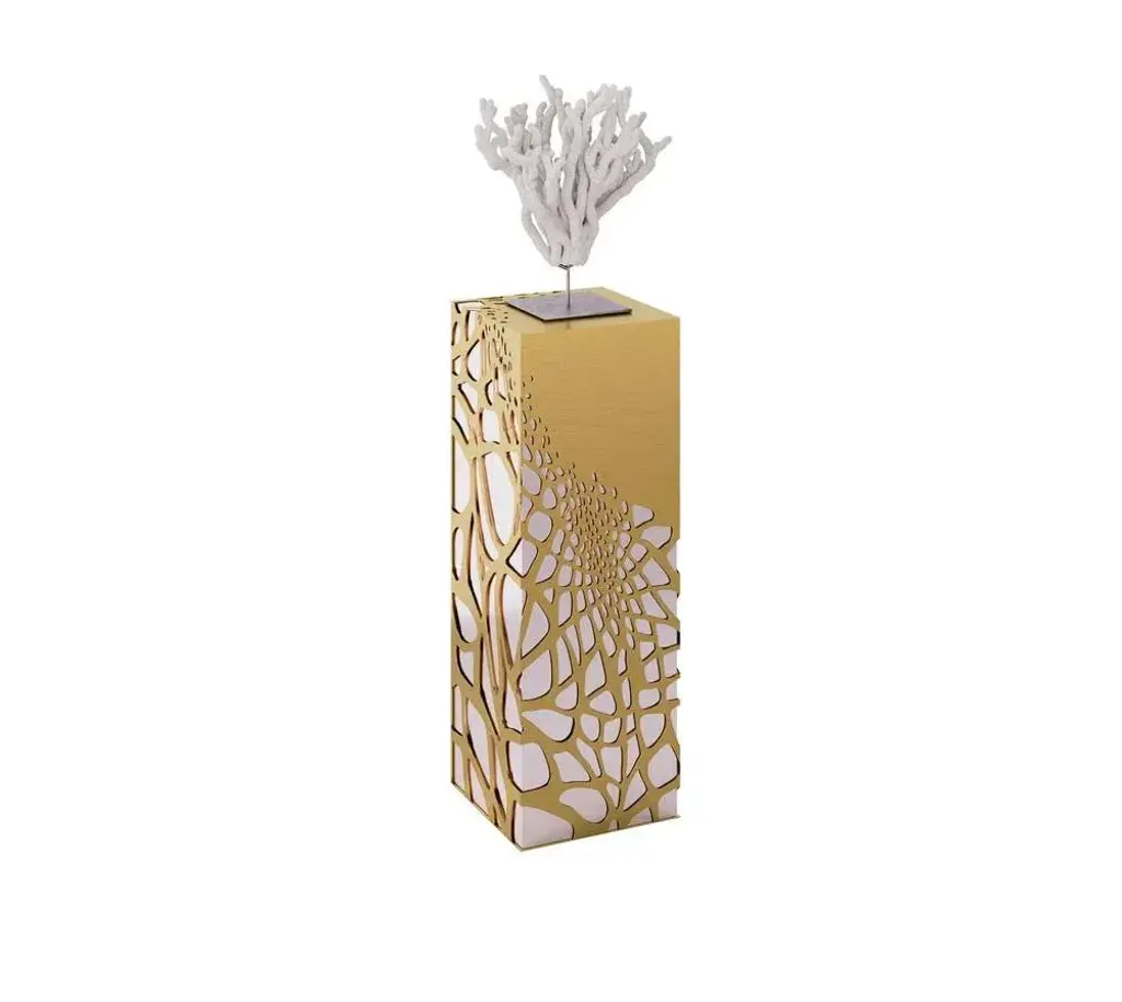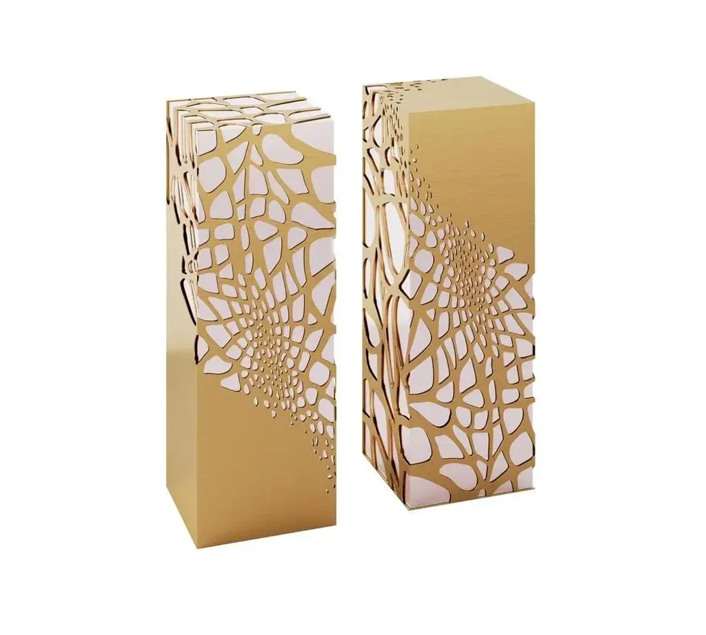 Lavish Pedestal by Memoir Essence Dimensions: D 35 x W 35 x H 100 cm. Materials: Brushed brass and polished stainless steel. One more exquisite product from Lavish collection. Inspired in “La Folie Divine”, the new Montpelier building from the architect Farshid Moussavi. As in this building, Memoir’s Lavish Pedestals have an organic perforation mesh that creates an effect of blend between the polished stainless steel body and the golden brushed brass cover. Lavish pedestals, present an elegant structure base involved by a brushed brass fluid and organic mesh, this pedestals are very versatile you can use it in your living room with some art or even flowers, you can use it in your retail project as luxury products displays, just give your creativity some freedom and enjoy.