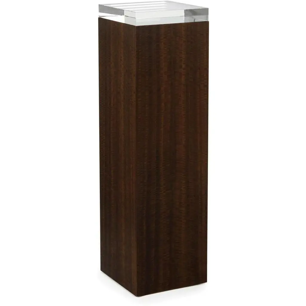 A modern pedestal in brushed stainless steel is finished in pale gold and paired with a glass top featuring gold leaf.