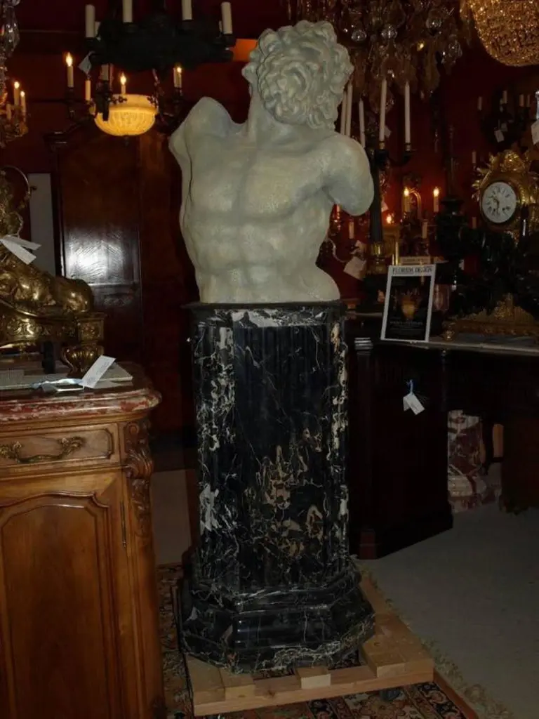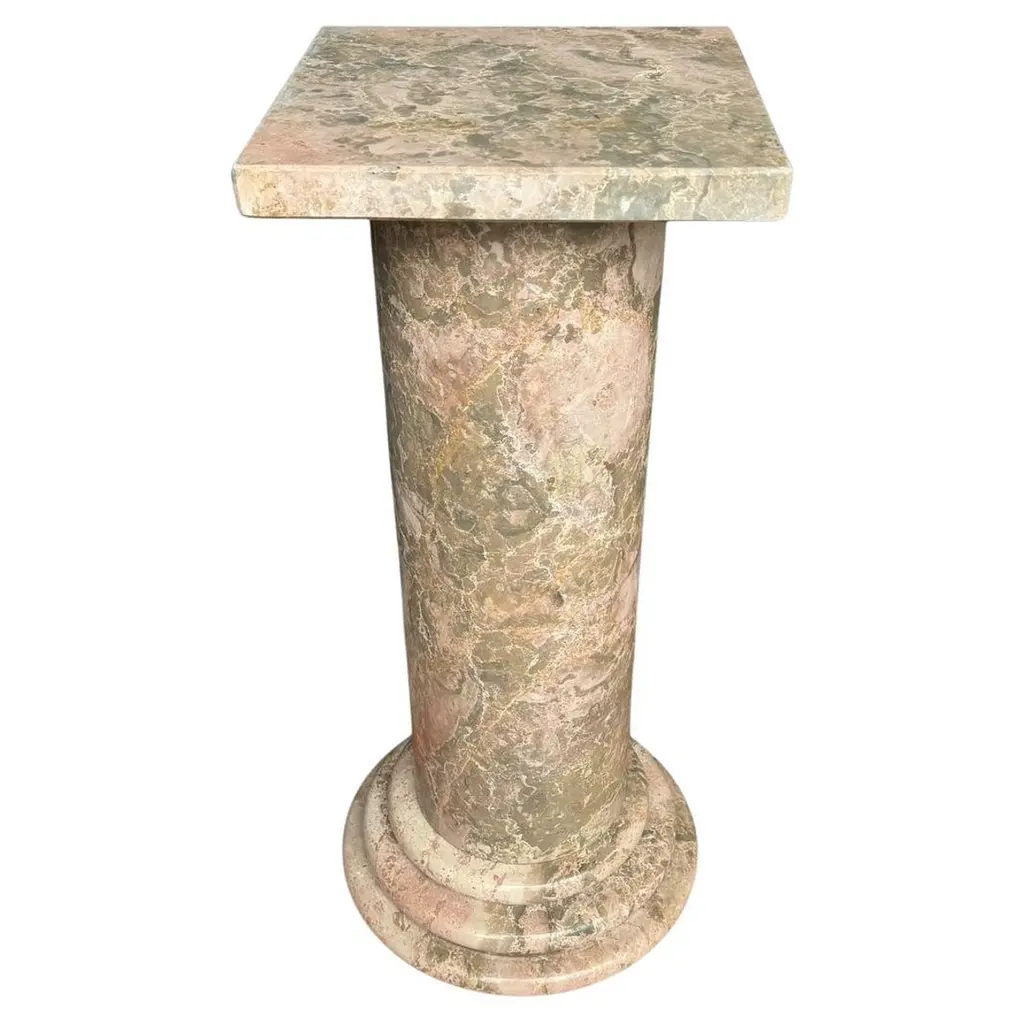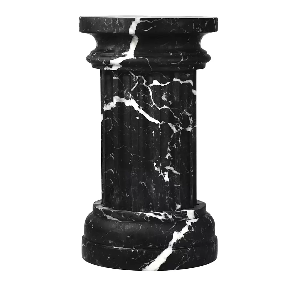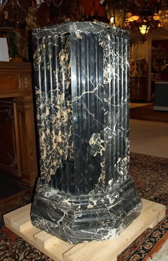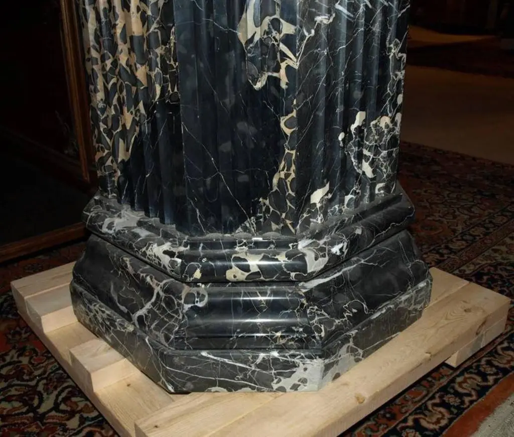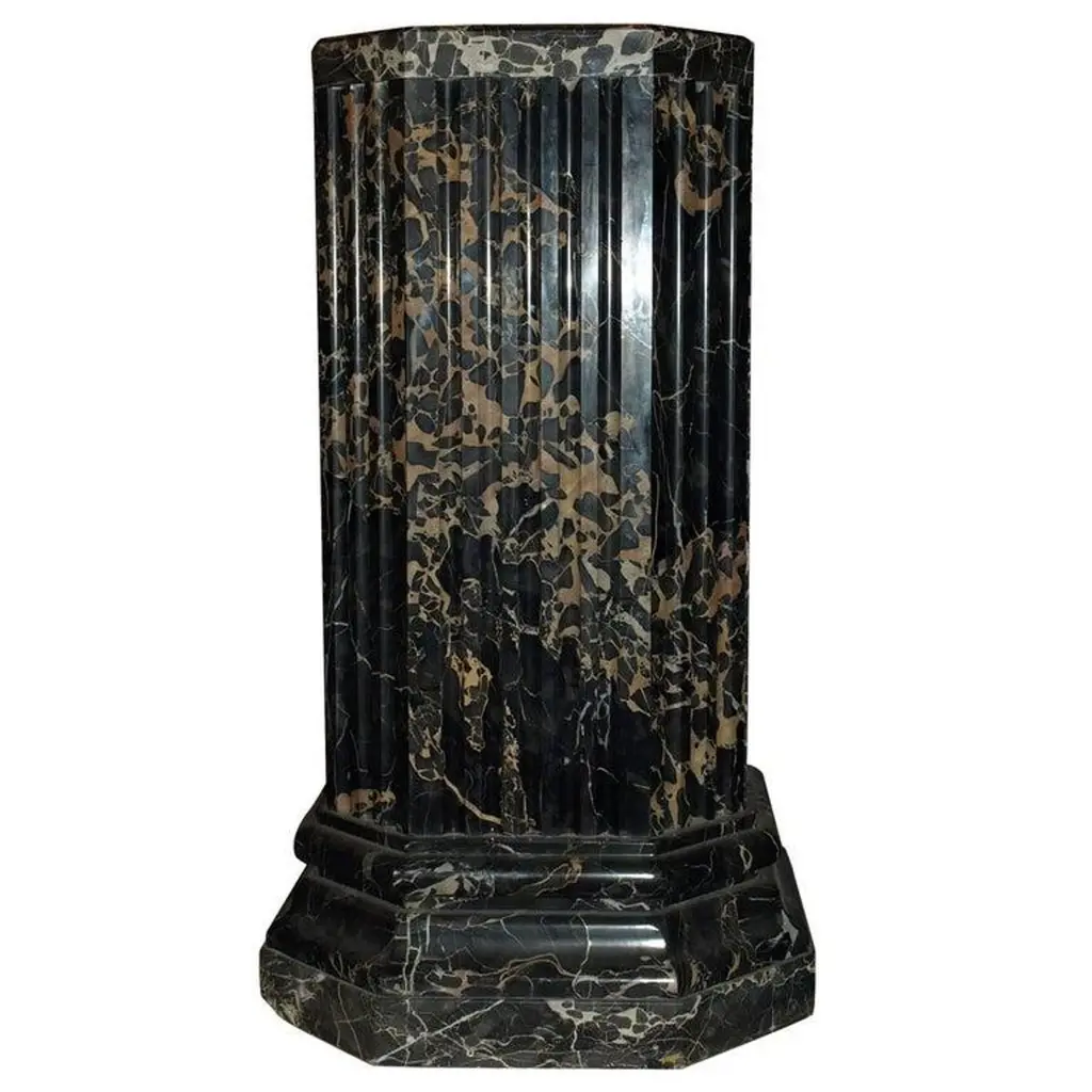 Very fine pair of portoro marble pedestals having an octagonal shape with reeded center pillar. The top is 18 inches by 18 inches. The base is 24 inches by 24 inches.CW4930Portoro is a fine-grained, black marble with gold veining resembling ripples in a stream. It is quarried in Portovenere, in the Gulf of La Spezia (Liguria), just one-hour drive away from the famous quarries of Carrara (Tuscany).