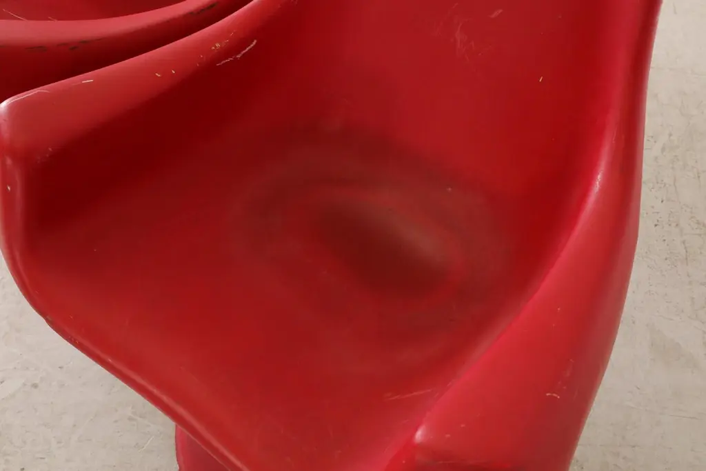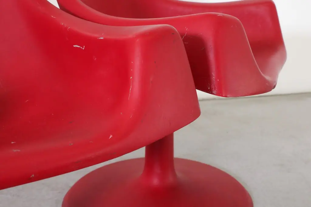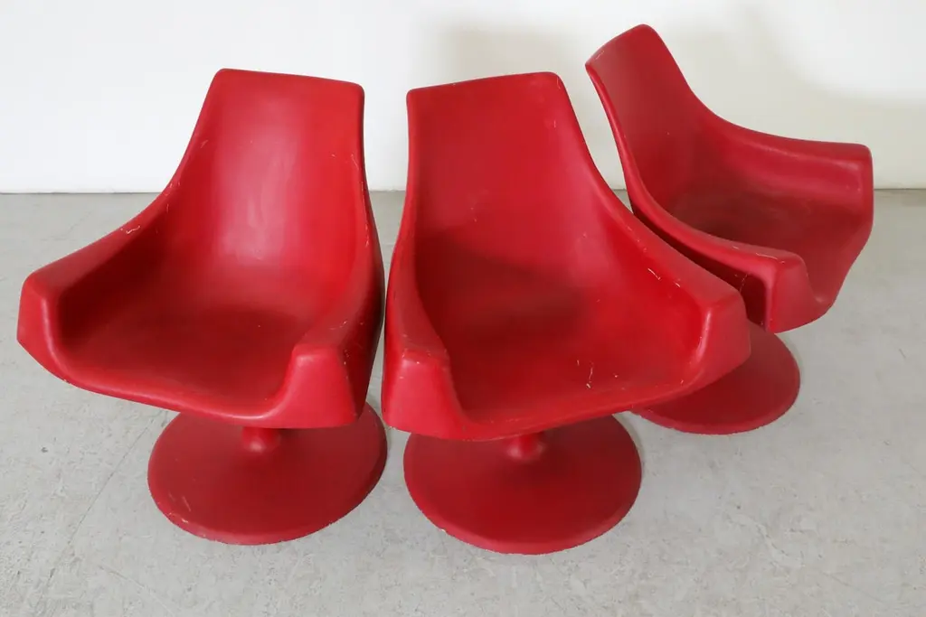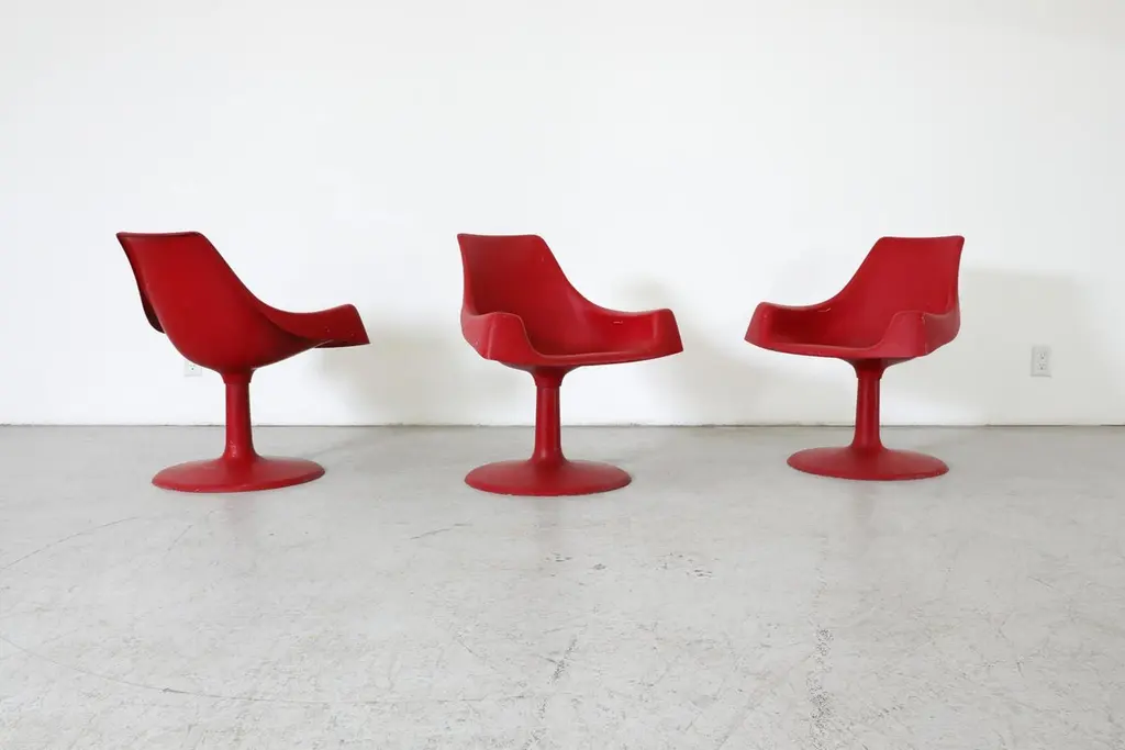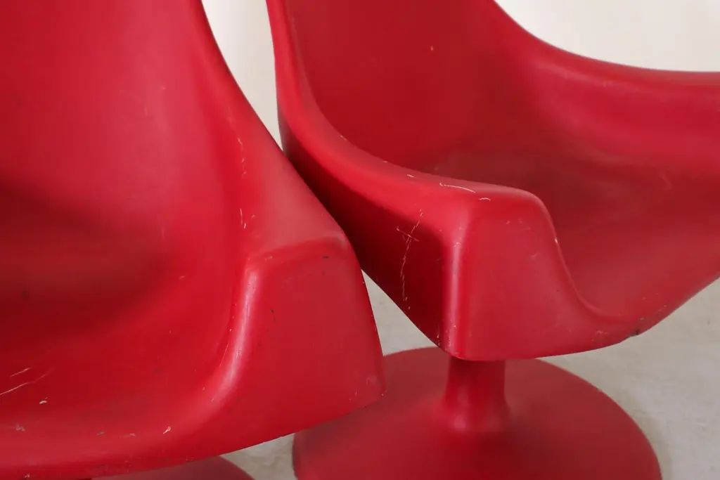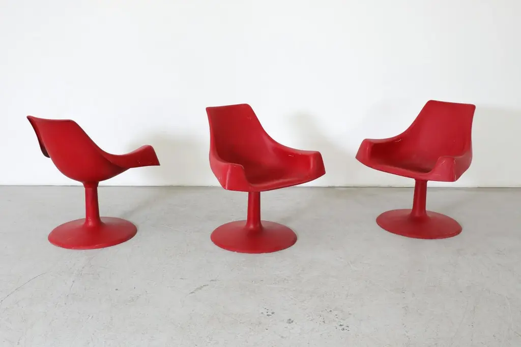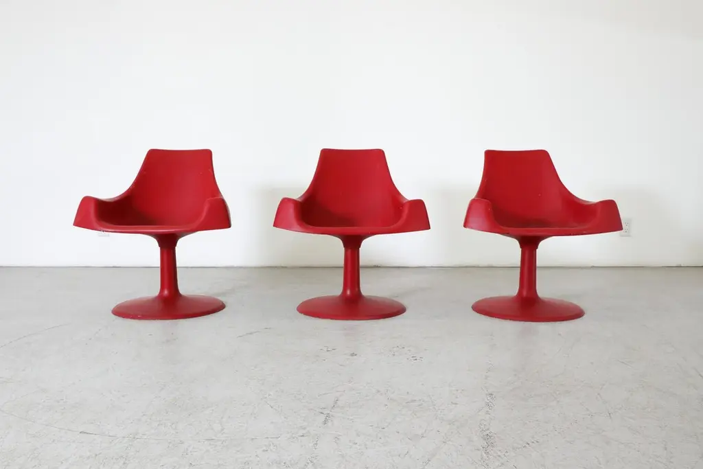 Space age, MOD, Eero Saarinen inspired red plastic molded armchairs with fixed pedestal bases. In original condition with visible wear consistent with age and use. 3 available.