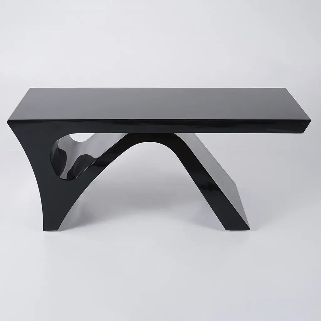 Upgrade your workspace with this sleek rectangular desk, combining modern aesthetics and durable engineered wood construction. The geometric pedestal base ensures rock-solid stability, while the glossy white finish resists stains and wipes clean easily. Perfect for home offices or workspaces, its curved edges and sculptural lines add a touch of contemporary elegance.