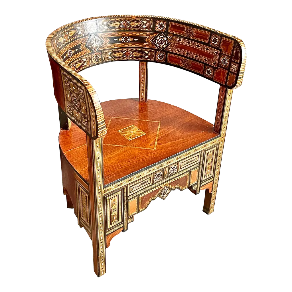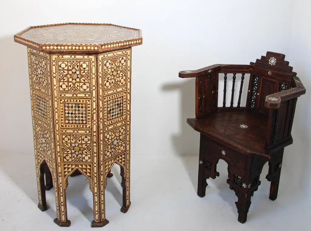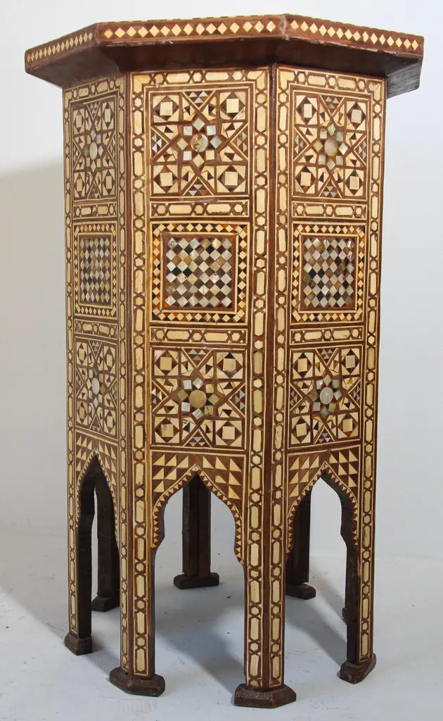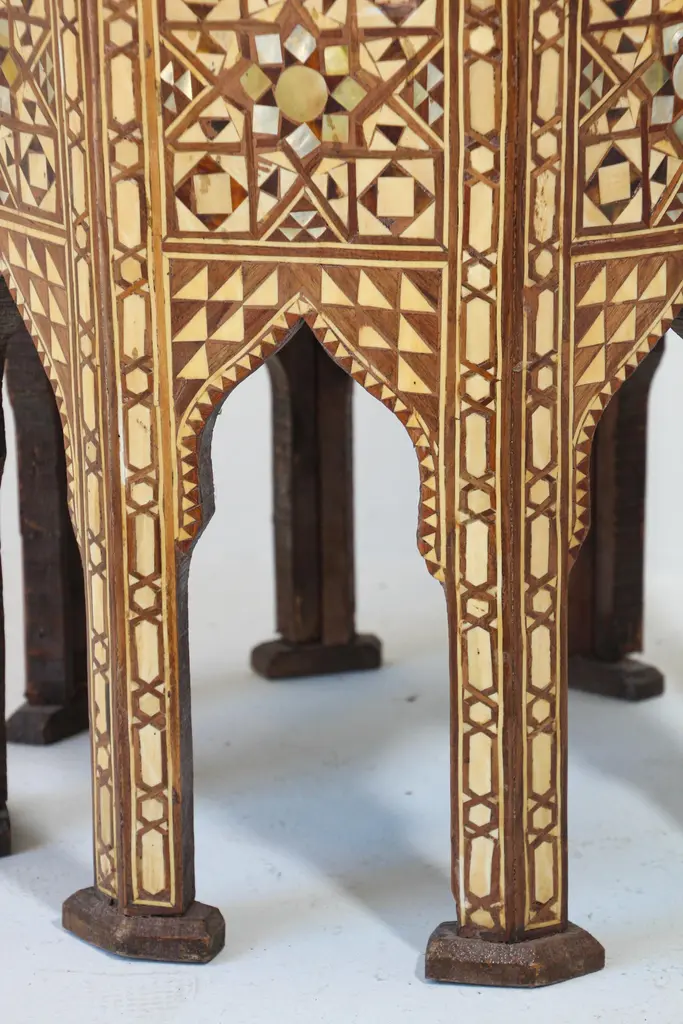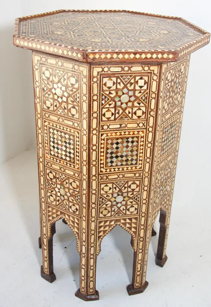 Moroccan Moorish style walnut octagonal pedestal table inlaid with mosaic marquetry.The tabletop is of octagonal form, decorated with various geometric and arabesque designs.The table is standing on eight legs separated by cusped and engraved arabesque designs arches,Middle Eastern Arabian Micro Mosaic side table with Moorish arches on the eight sides,Levantine pedestal table finely inlaid and handcrafted by skilled artisans.Great addition for any Bohemian Moroccan room project.Very intricate inlay Moorish artwork.Dimensions: Height 35 in. Width 24 in. Depth 22 in.