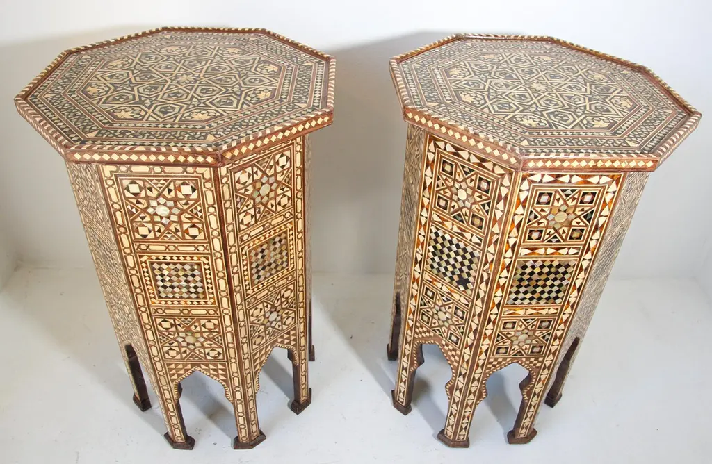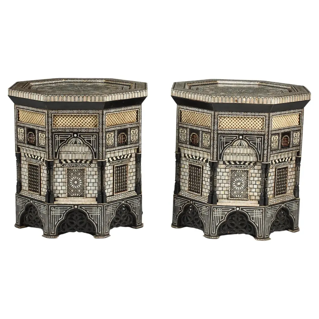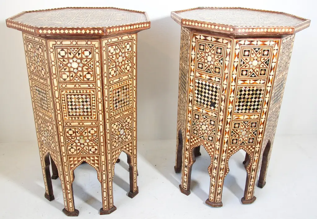 Pair of Moroccan Moorish style walnut octagonal pedestal tables inlaid with mosaic marquetry.Tabletop is of octagonal form, decorated with various geometric and arabesque designs.The table is standing on eight legs separated by cusped and engraved arabesque designs arches,Middle Eastern Arabian Micro Mosaic side tables with Moorish arches on the eight sides,Levantine pedestal tables finely inlaid and handcrafted by skilled artisans.Great addition for any Bohemian Moroccan room project.Very intricate inlay Moorish artwork.Dimensions: Height 35.25 in. Width 24 in. Depth 22 in.