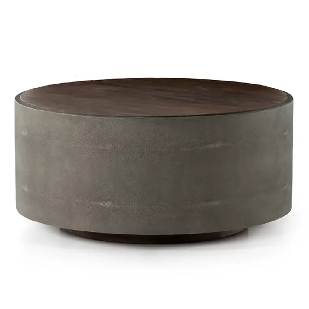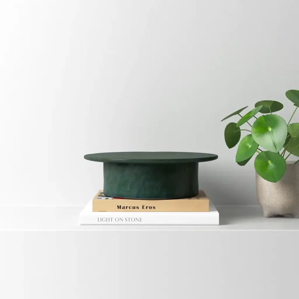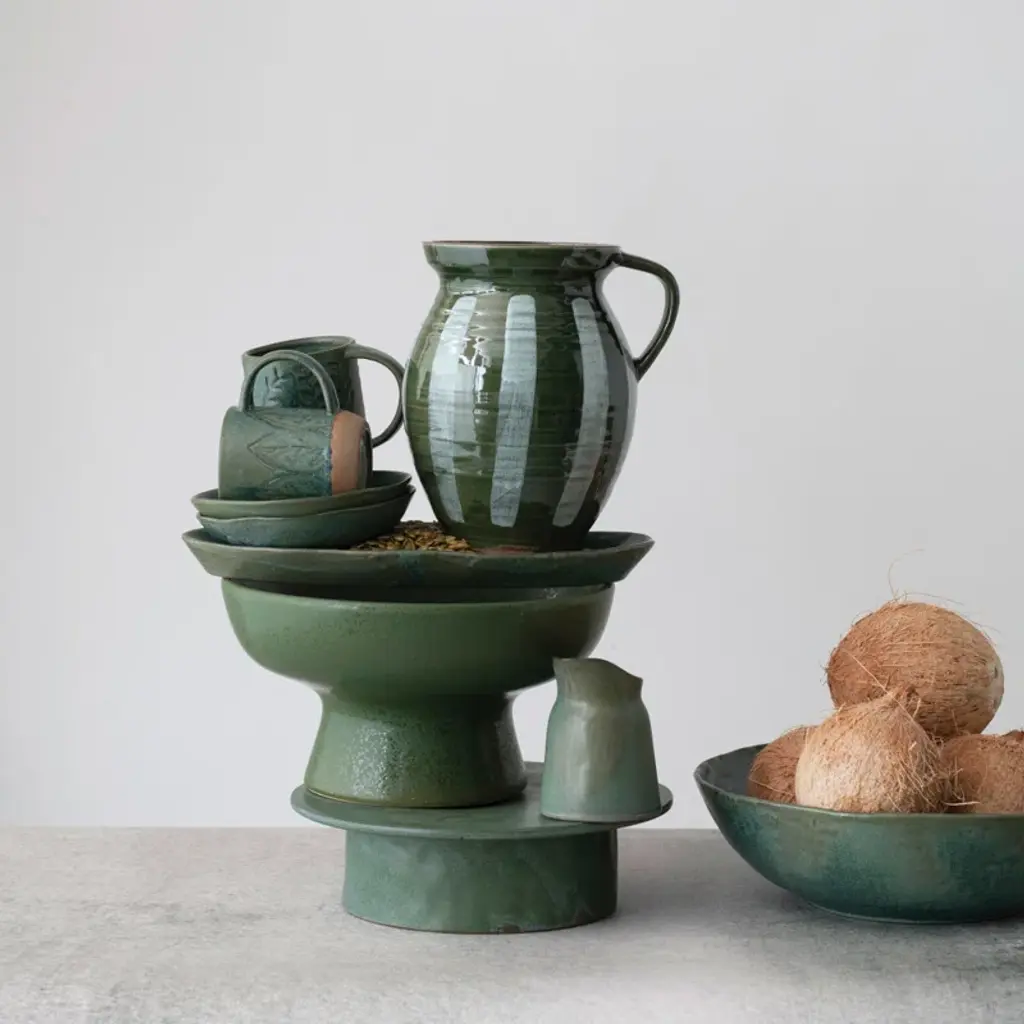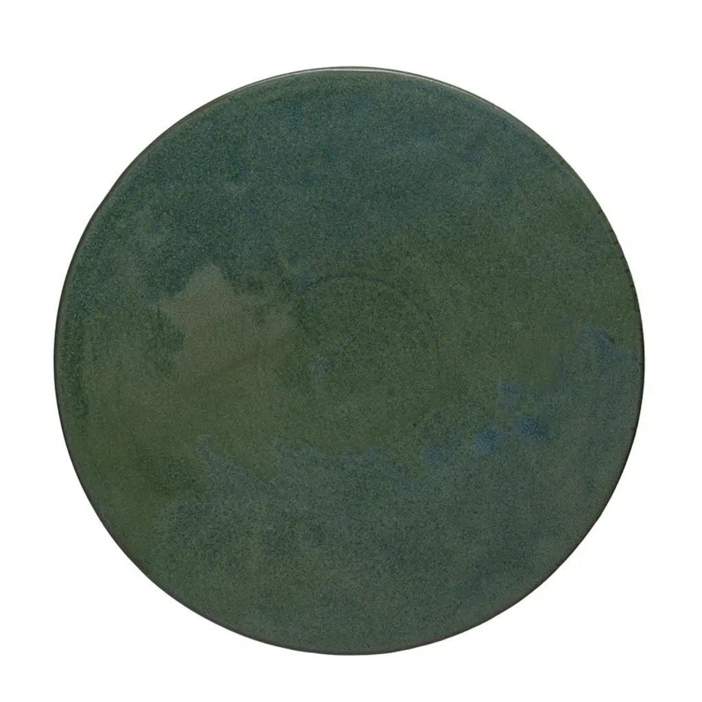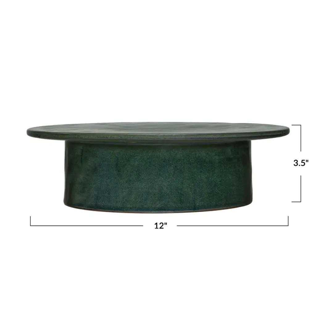 This contemporary stoneware pedestal features a naturally variating reactive glaze