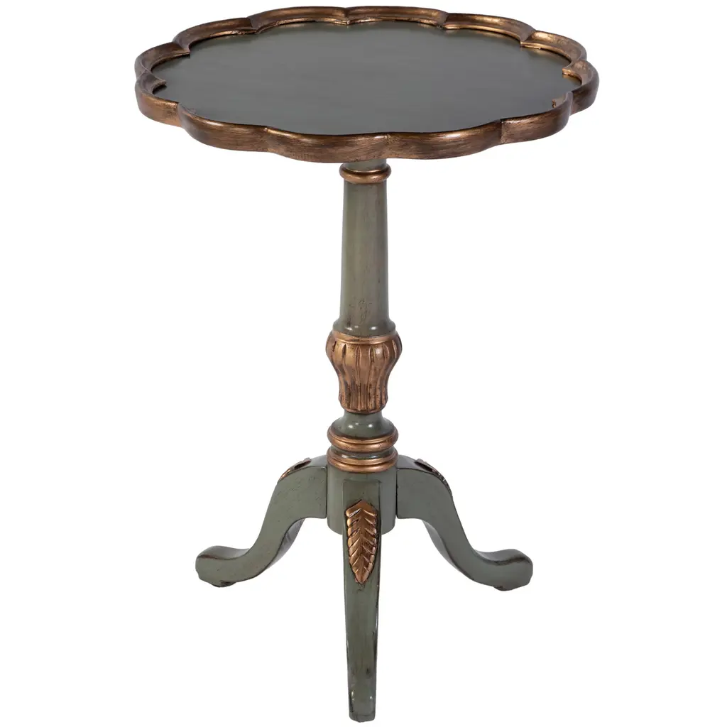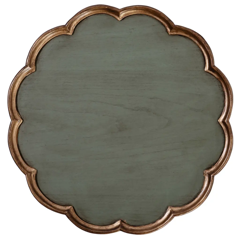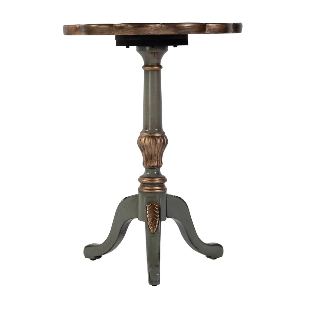 Enhance your home decor with a touch of traditional sophistication using the Nadia 20 in. W Round Wood Scalloped Edge Pedestal Side Table. Crafted from solid woods, wood products, and wood veneers, this elegant accent table is ideal for displaying decorative items. Intricate hand-carved details on the base and legs complete its stunning look.