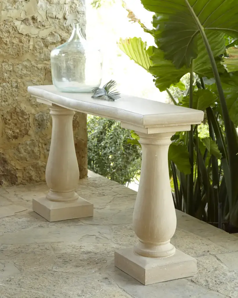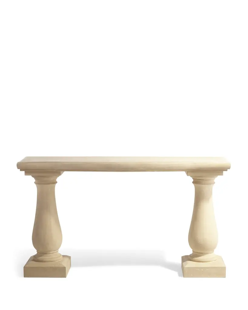 EXCLUSIVELY OURS. Handcrafted console table. 60"W x 16"D x 33.5"T. Crushed stone/polyester resin/styrene/fiberglass. Latex finish. Imported. Boxed weight, approximately 93 lbs. undefined