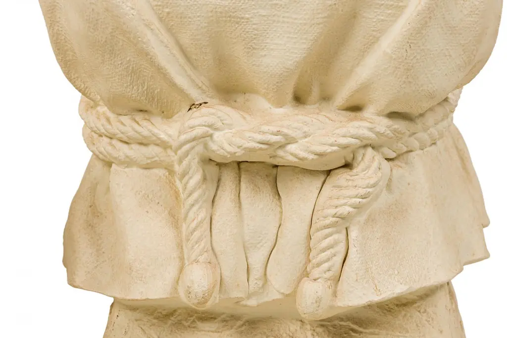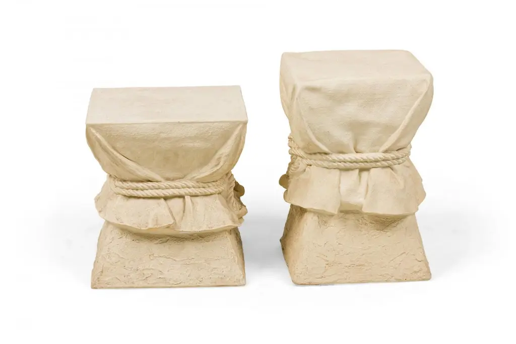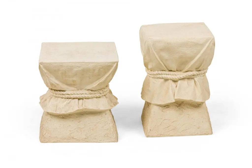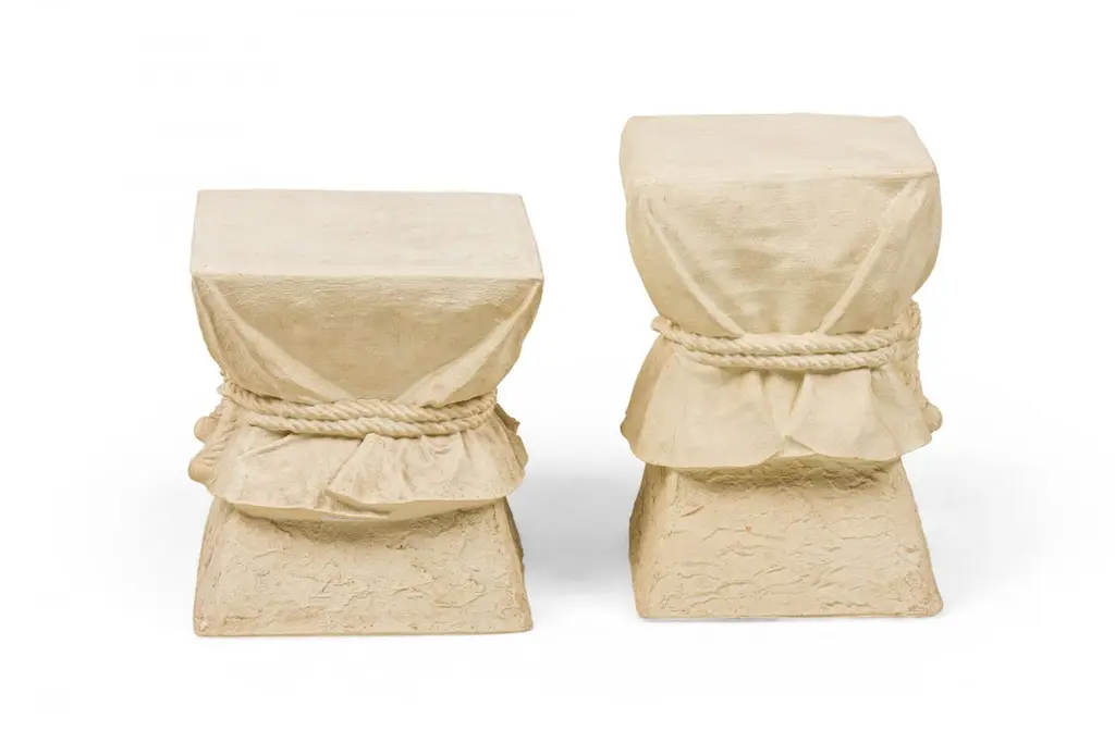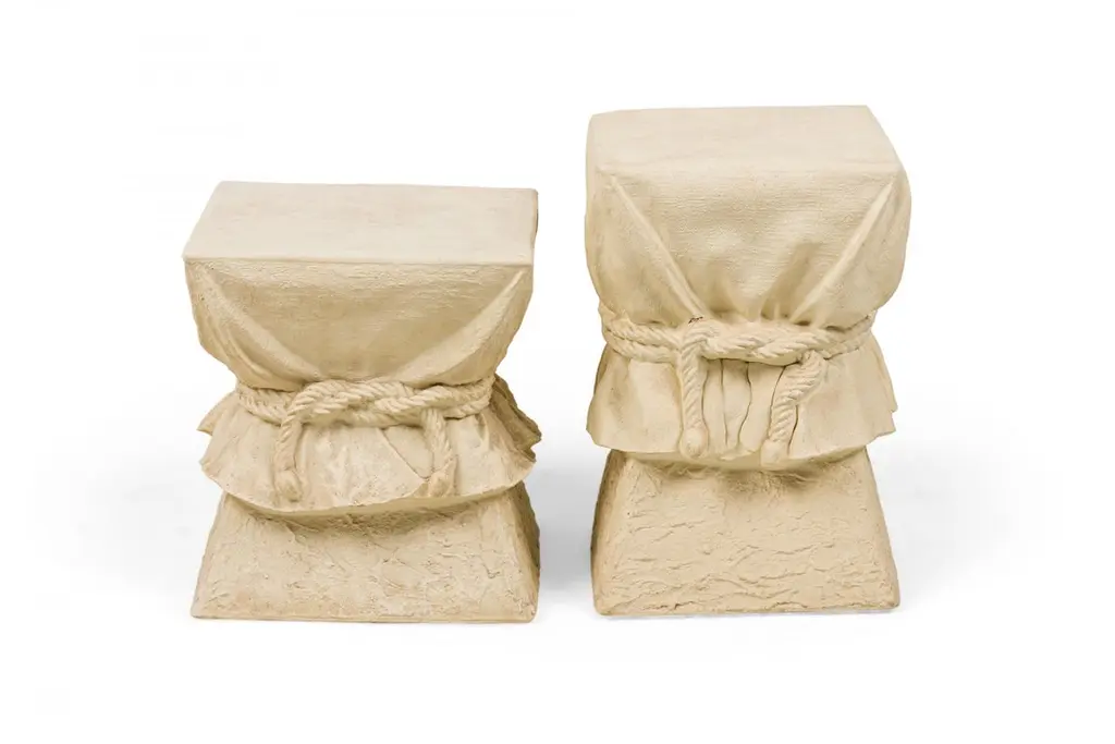 Pair of Contemporary French (circa 1980) similar inverted pyramid form drapery and rope occasional pedestal tables made of white gesso and resin-infused burlap and jute over wood forms (manner of ALBERTO PINTO)One 14" HT, one 17.5" HT