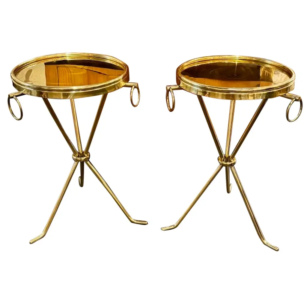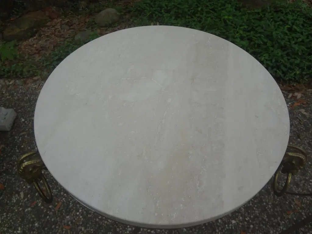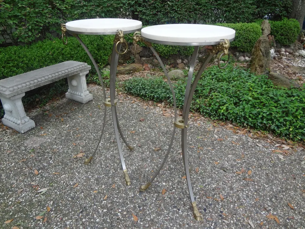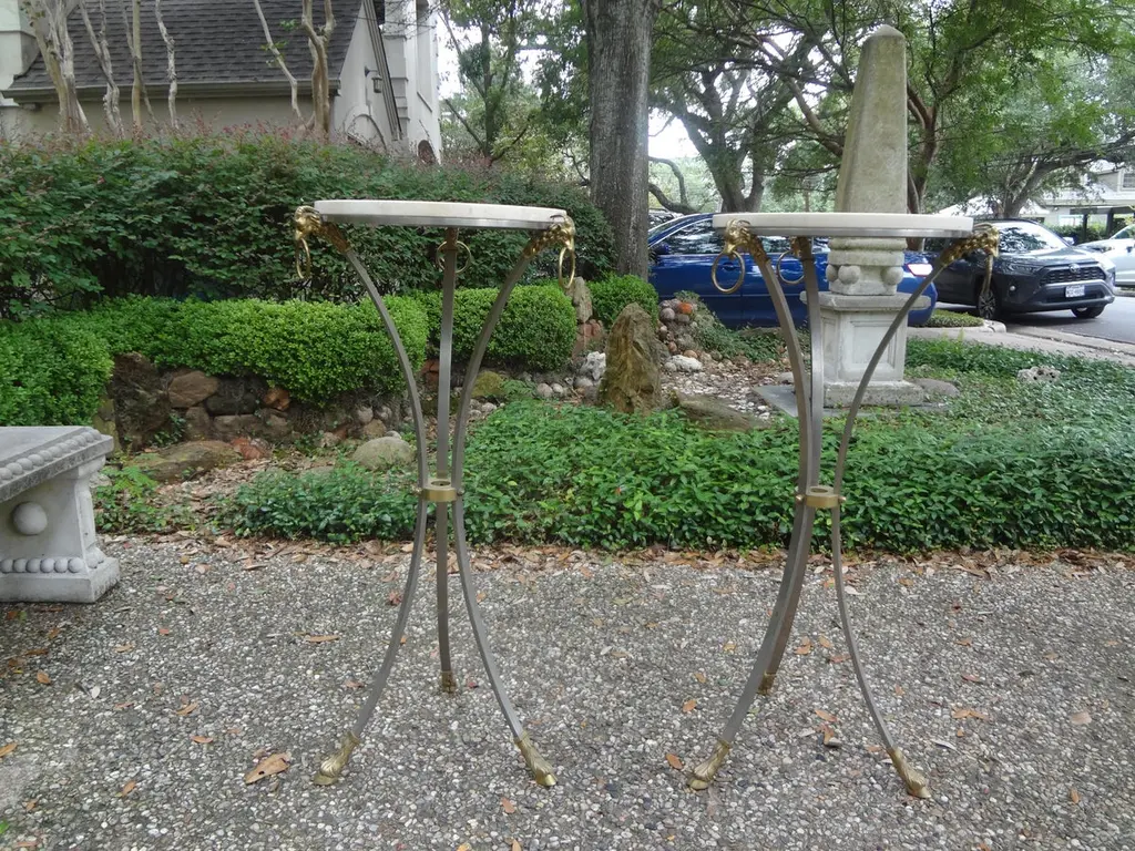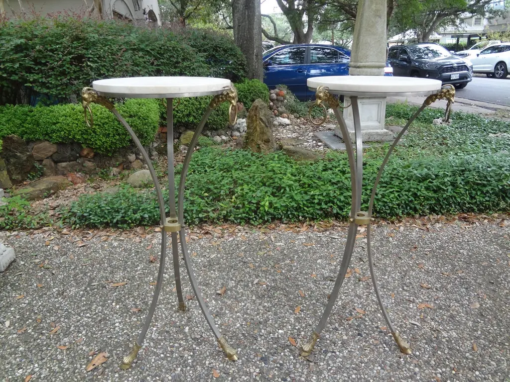 Pair of Italian brushed steel and brass pedestals with travertine tops.Stunning pair of Hollywood Regency Italian brushed steel and brass pedestals or stands with travertine tops. These great Italian Modern pedestals are executed in brushed steel with brass Ram's heads and hoof feet with travertine tops. Our versatile Italian Neoclassical style pedestals or tables would be great to display your prized treasures or sculptures or used as plant stands.Measures: Top travertine surface is 15.82 inches.This listing is for a pair!