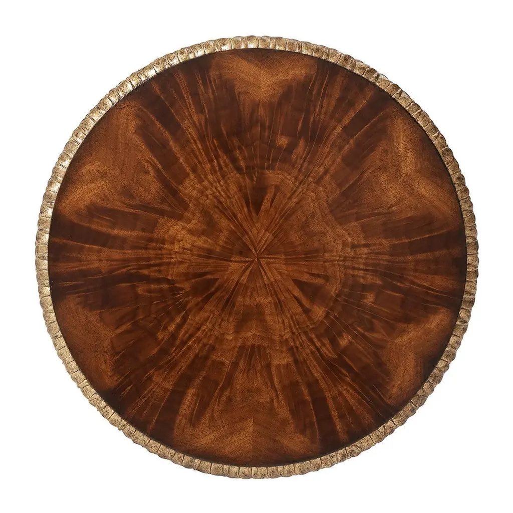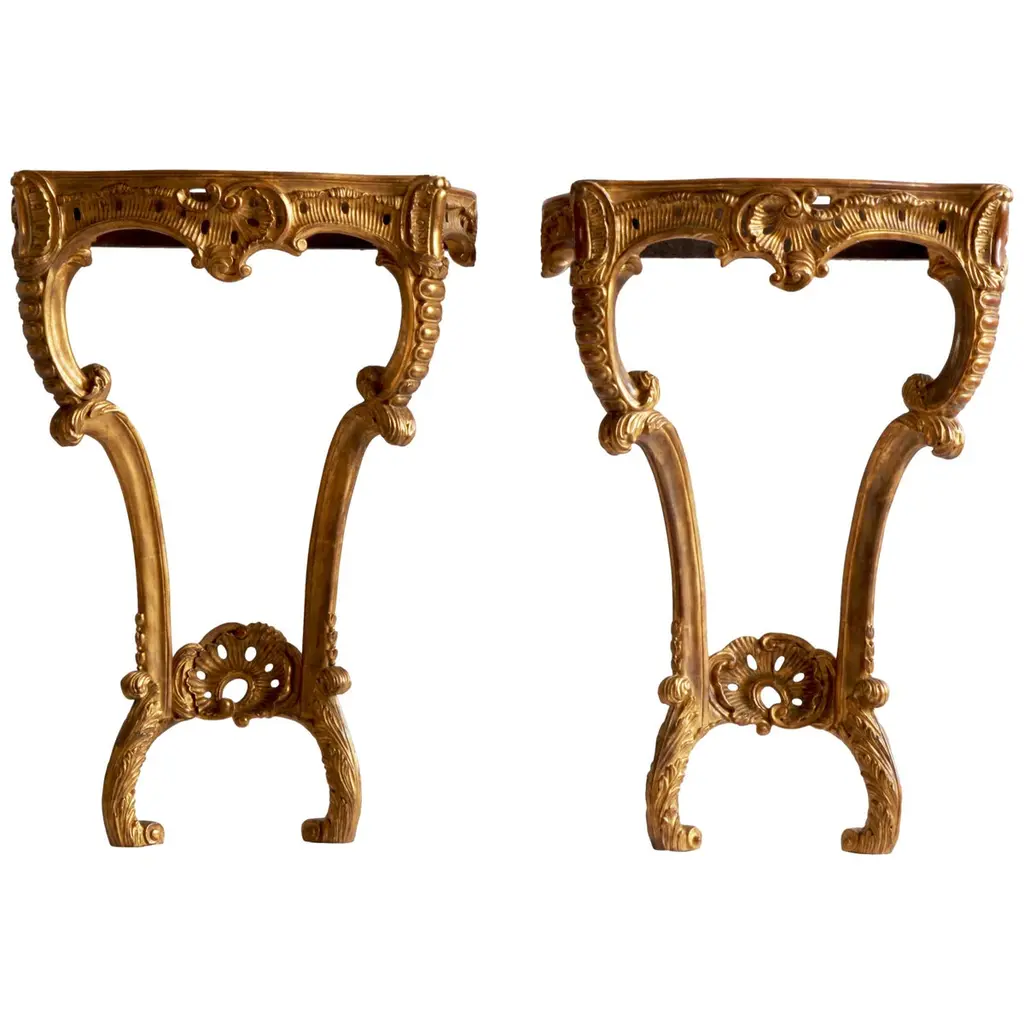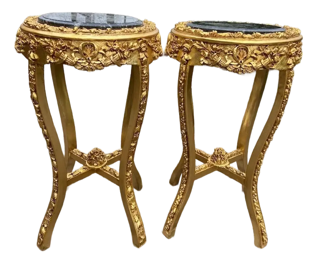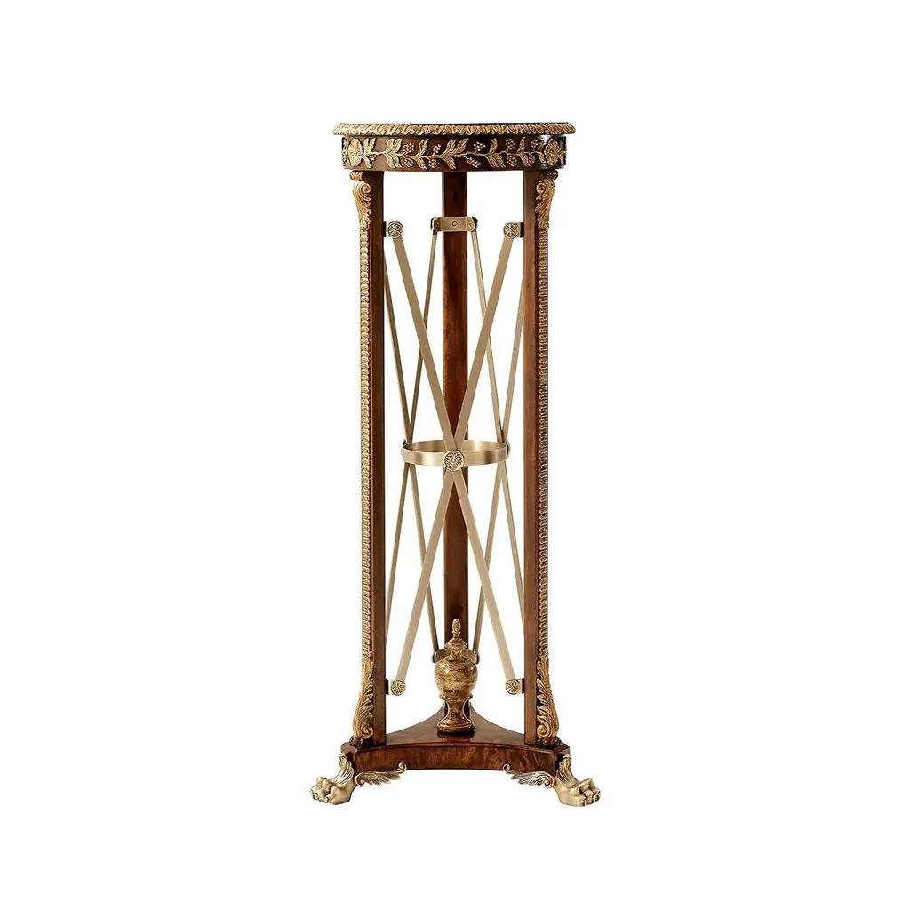 A fine pair of Regency style pedestals or carved and gilt torchères, the circular top with a carved edge and frieze, on three supports with acanthus bases and capitals, the whole supported on a trefoil concave base and raised on brass winged lions paw feet. The central 'X' form structure of stretchers in brass centered by a ring decorated with flowerhead paterae.Dimensions: 18.5" W x 16.5" D x 44" HShips in 16-28 weeks.