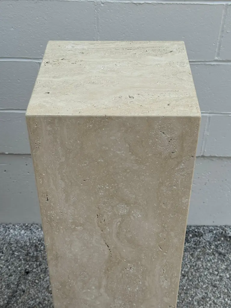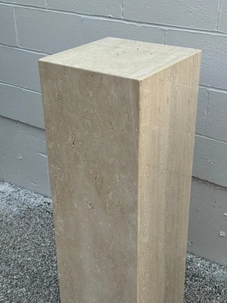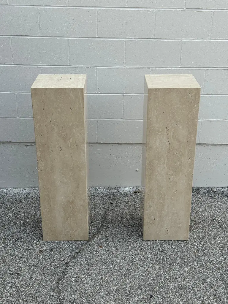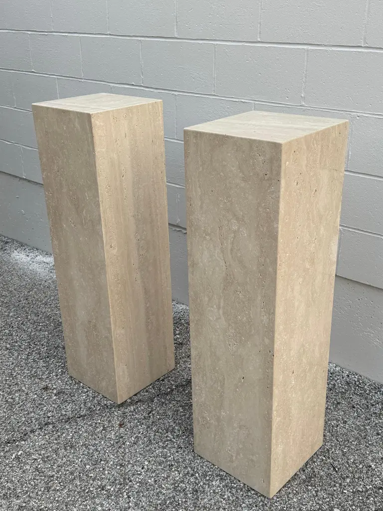 Wonderful 1980s Post modern Italian pair of matching Travertine art pedestals, stands or columns. Made of Italian beige vein cut travertine. In very nice condition.