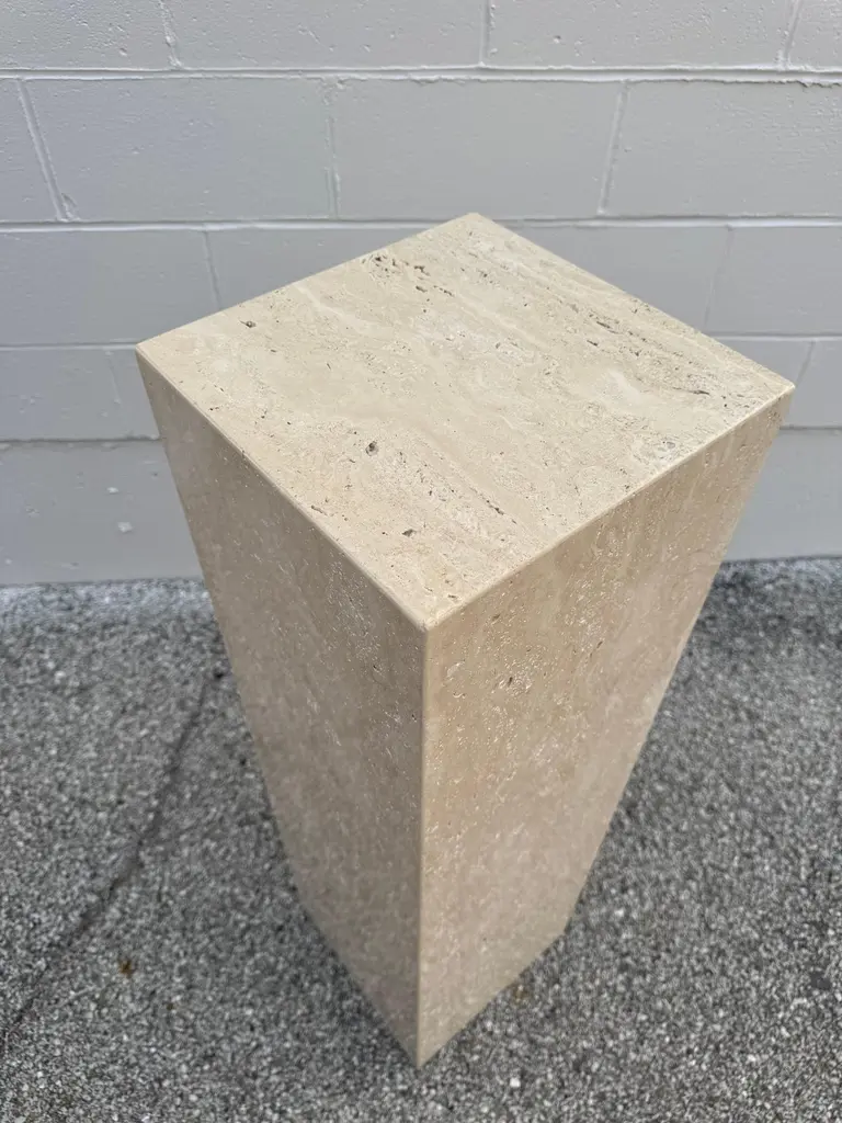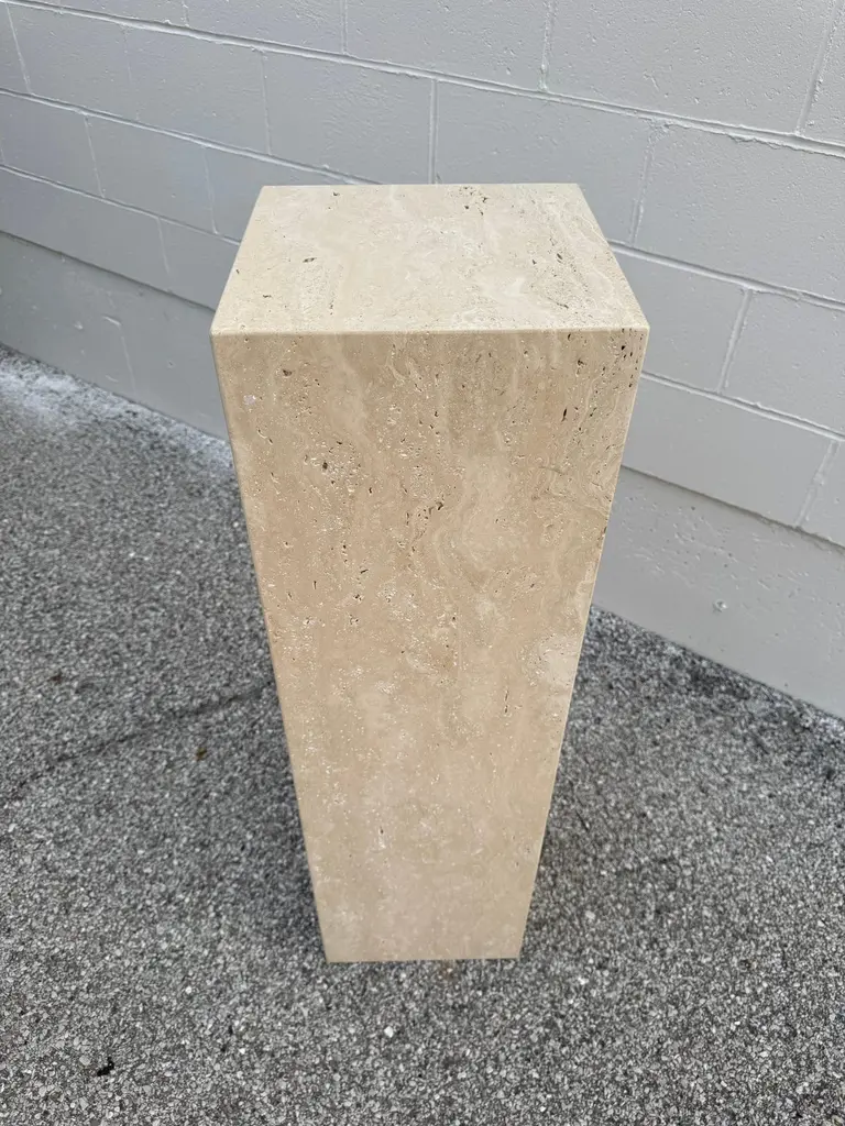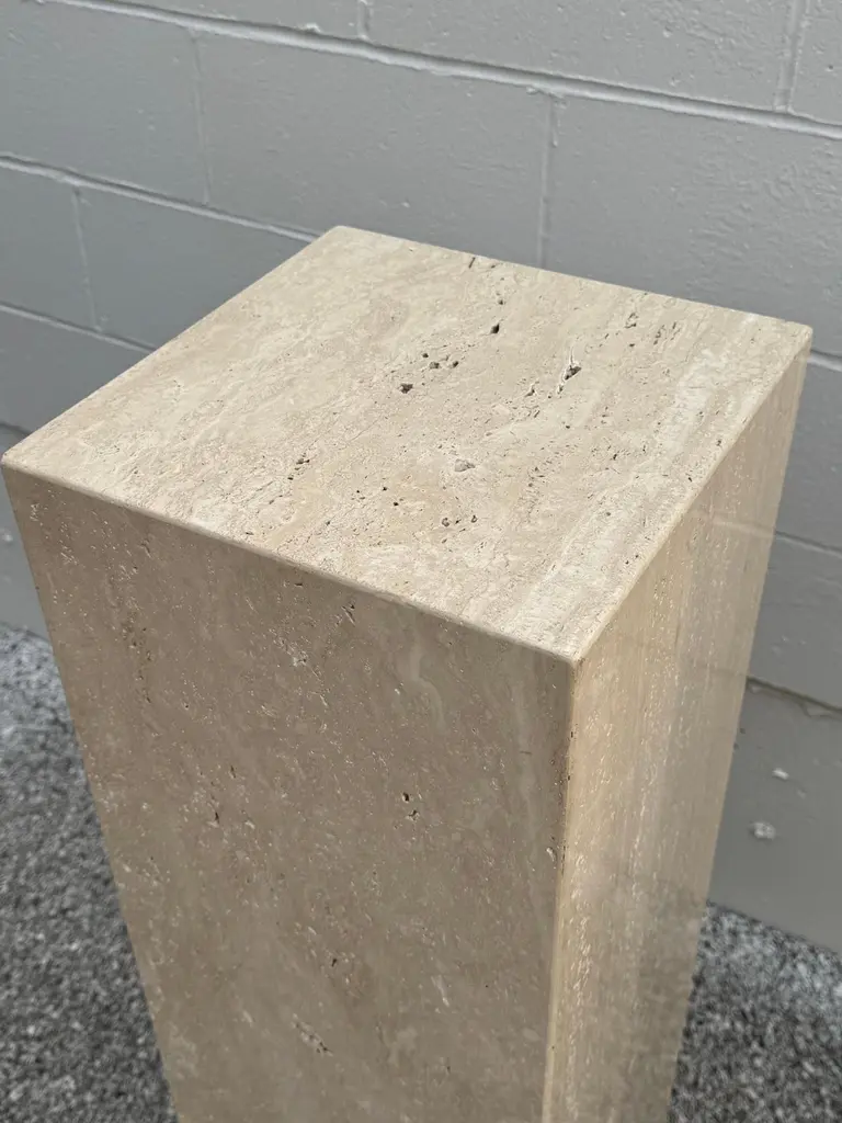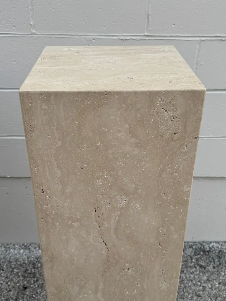 Wonderful 1980s Post modern Italian pair of matching Travertine art pedestals, stands or columns. Made of Italian beige vein cut travertine. In very nice condition.