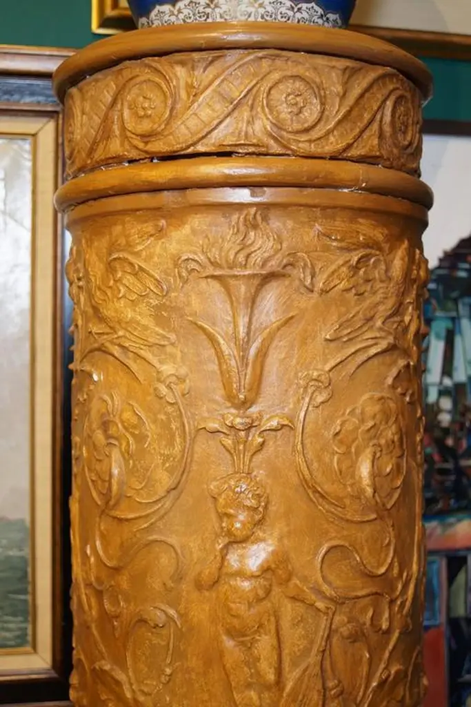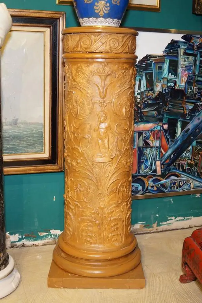 Pair of vintage gesso pedestals dating from the second quarter of the 20th century, with various Greco-Roman neoclassical motifs in relief, including cherub with instrument, mask, birds, floral bouquets, foliate scrolls and ribbons.