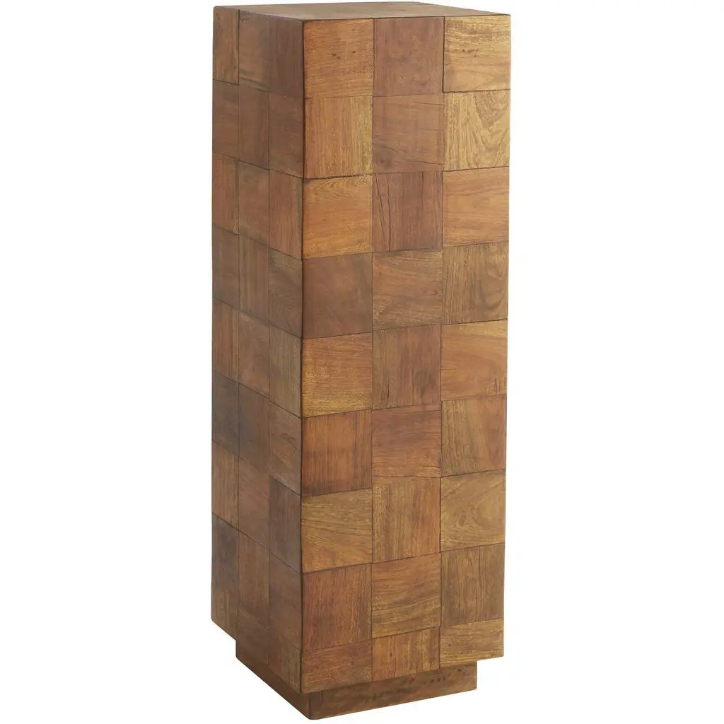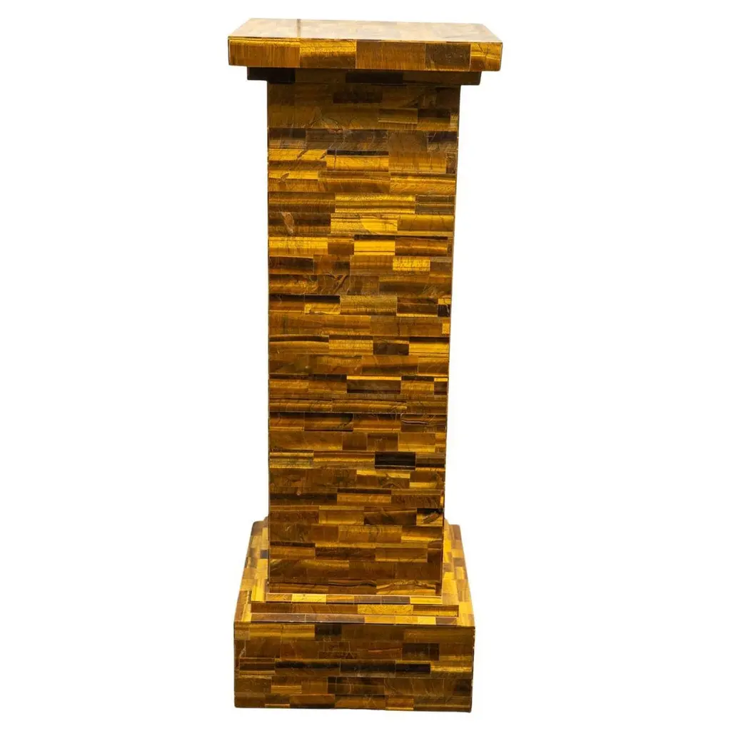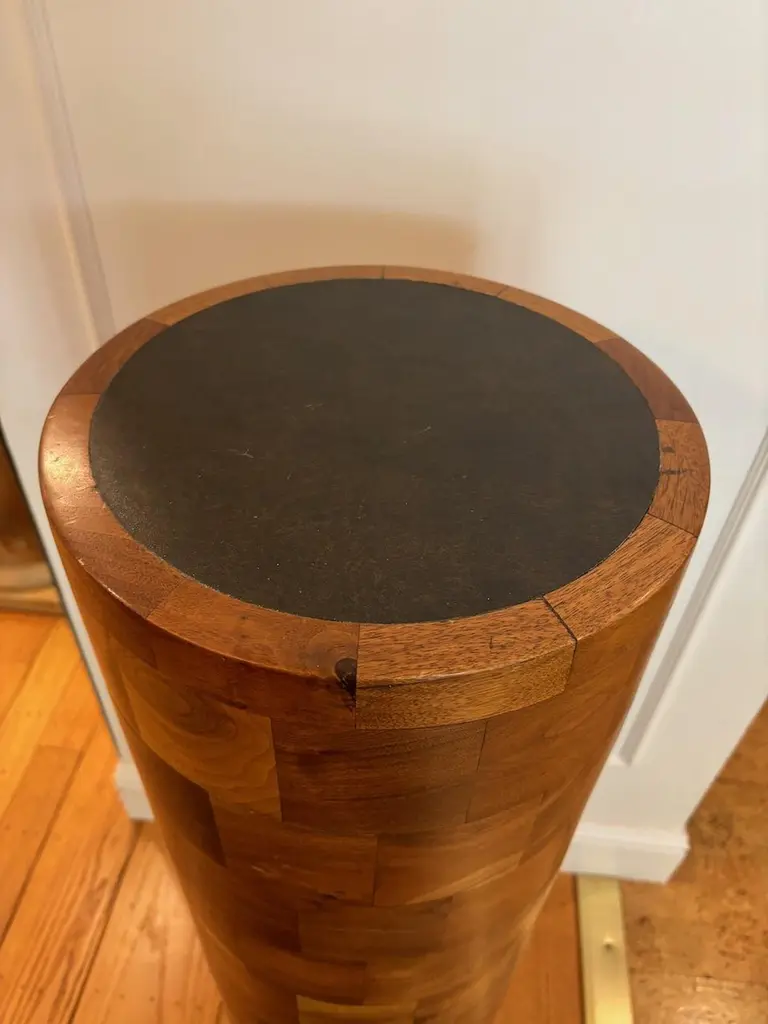Beautiful Walnut Patchwork Pedestal with inset black laminate top attributed to Paul Evans' Cityscape line. The pedestal is in excellent original condition and is free from damage and repairs. The piece was very well cared for and shows virtually no wear or fading at all. Sits flush on the floor without glides but could also accommodate glides if deemed necessary.