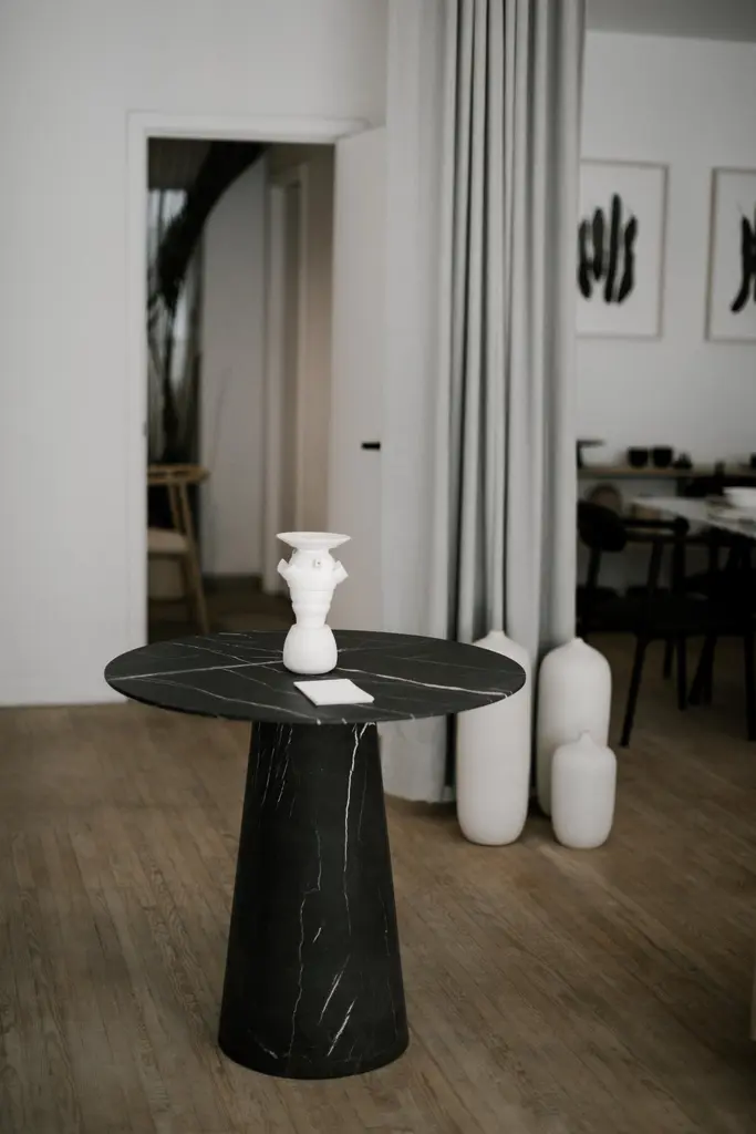 Table in carved Monterrey black marble. Handmade in Mexico. Production time: 6-8 weeks for items without marble / 13-14 weeks for marble pieces. Shipping +10 additional business days. Casa Quieta uses natural materials such as woods, stones, fabrics etc. These materials may vary in tone, veining, and cavities due to their natural origin. This is part of the inherent beauty of materials and is not considered a flaw. Due to the artisan nature of our production process, there is a +/- 3mm measurement tolerance.