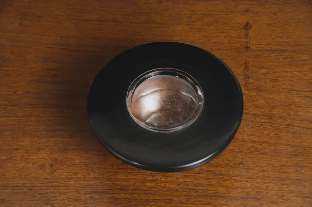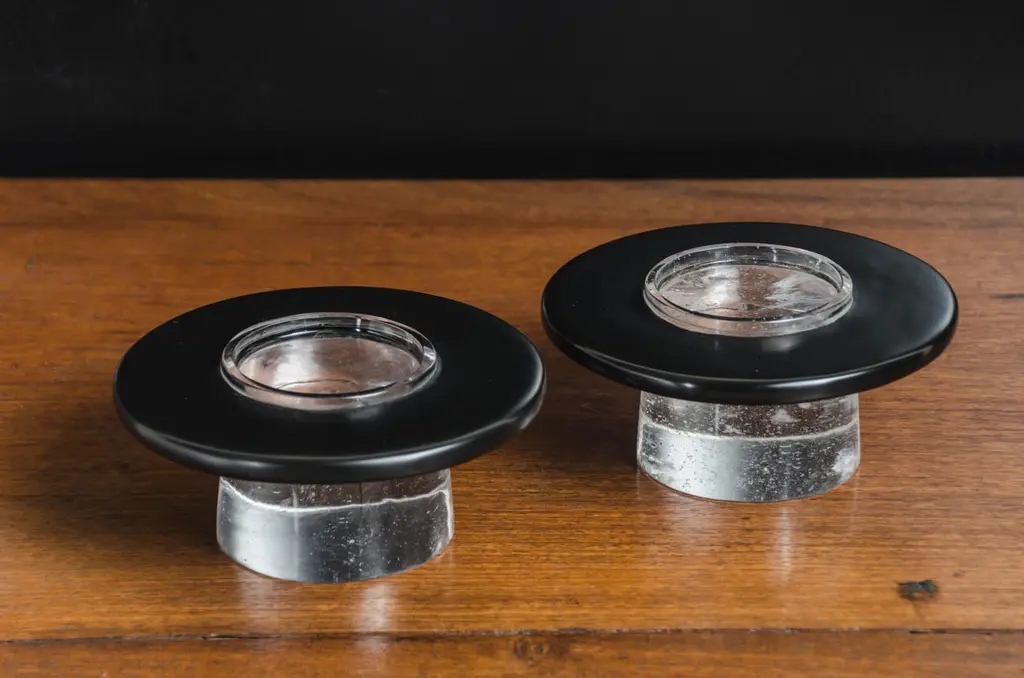 Pedestal candleholderBlack lacquerCrystalHand carvedLimited EditionLacquer is a technique that dates back to the Shang dynasty, circa 1600-1100 B.C. The pieces are made with at least 60 coats of organic lacquer. Each layer of lacquer is applied with a curing period of 24 hours in between so that it can dry.